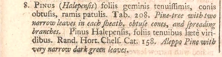 Pinus halepensis Mill. Nome assegnato da Philip Miller nel suo celeberrimo Gardeners Dictionary, ottava edizione al numero 3 del set di pagine denominate con la sigla PIN-PIN. Miller, giardiniere di Chelsea, fu fiero oppositore della nomenclatura linneana, di cui ritardò l’adozione in Inghilterra per decenni. Poi cedette vinto dalla realtà dei fatti, e nell’ottava edizione del Dictionary finalmente si adeguò.