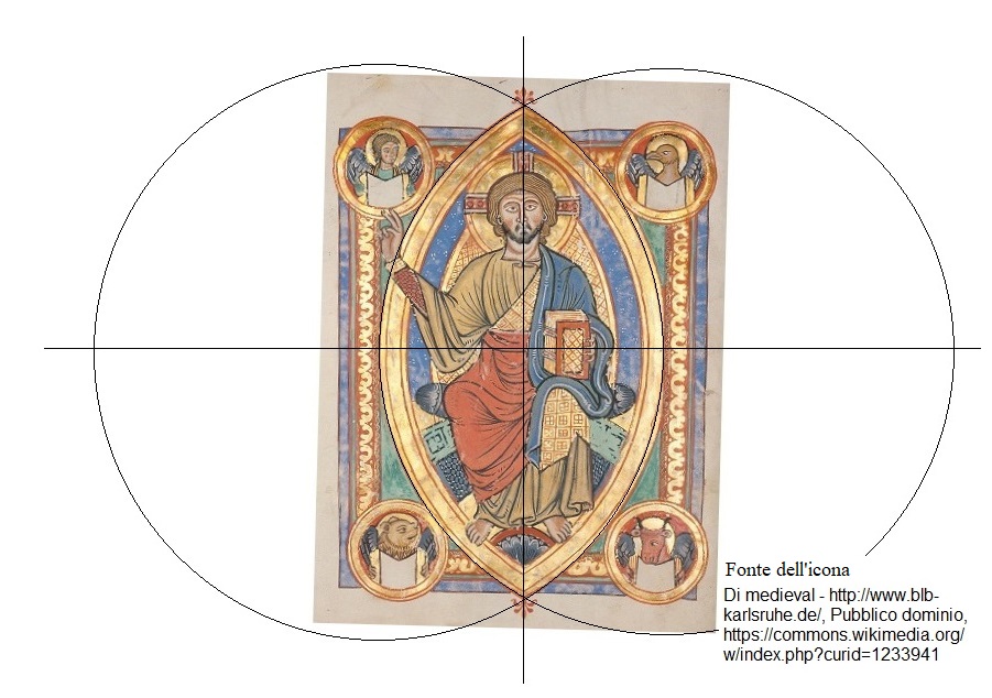 Per costruire un triangolo equilatero sulla base, unitaria, AB basta tracciare i due cerchi di centro A e raggio AB e centro B e raggio BA rispettivamente. E questo si sa dai tempi di Euclide. Cosicché il segmento CD, il doppio dell’altezza del triangolo ABC, vale radice di tre; e ciò basta per costruire, con riga e compasso, il segmento radice di tre. (Elementi, Libro I, Proposizione I) Ma non basta: l’intersezione dei due cerchi dà luogo alla ben nota ‘mandorla’ (o vesica piscis), figura da sempre oggetto di ammirazione e mistero. I cristiani ci racchiudevano prevalentemente il Cristo, di preferenza benedicente. Tre di certo è la trinità, ma la radice? Beh facile: l’incommensurabilità…