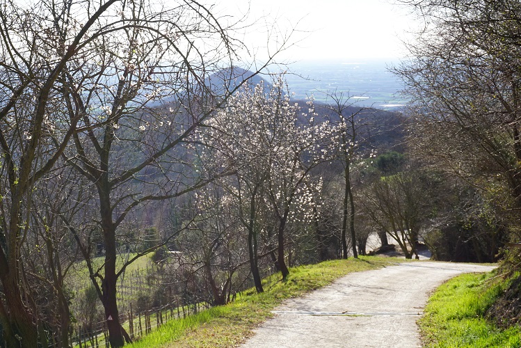 Mandorlo in fiore ai primi di marzo. Via Duca degli Abruzzi.Giardini Santa Rita, giovane Mandorlo fiorito. Contemporanea la fioritura della forsizia.L’albero ha dimensioni modeste, il portamento è espanso con i rami alquanto mossi. Corteccia, rami e rametti grigi. L’esemplare della foto precedente, in Via Monte Grappa, un paio di mesi più tardi.Purtroppo questo Mandorlo è vittima di un fungo: Inonotus hispidus, a giudicare dall’escrescenza (carpoforo) a mensola che emerge dal tronco. Il patogeno deve essere entrato proprio dalla ferita lasciata da una lontana potatura (forse un ramo che sporgeva sulla strada). [Ringrazio il mio amico R. O. per le dritte sul fungo] Fiore bianco più spesso rosato a simmetria pentagonale con la punta dei petali intaccata.Fiori isolati sui rametti o al massimo a coppie,… …stami numerosissimi, antere da arancio a viola rossiccio, unico pistillo.Calice rossiccio e allungato, ovario semi infero.I frutti maturano in estate e la raccolta è settembrina. Un mallo, dapprima verde poi marrone da secco, ricopre un involucro poroso che custodisce il seme: la mandorla. Aprile, sta per liberarsi dell’androceo e della corollaLuglioSettembre, frutto maturo. La raccolta avviene, oggi come ieri, agitando i rami e lasciando cadere il frutto.Foglia allungata più larga verso la base, breve picciolo, margine lievemente dentato.Vistosa nervatura centrale, accentuata dal ripiegarsi a V dei lembi della foglia.Fillotassi alterna.Corteccia grigio metallizzata, specie negli esemplari giovani, con lenticelle orizzontali a tratteggiare anelli attorno al tronco. Piccolo giardino presso il Bastione Pontecorvo. Sullo sfondo il muretto che indica il tracciato delle Mura; distrutte in questo tratto. Fiorito a inizio marzo. In secondo piano una esuberante Mimosa.Giardino privato in Via Tirana. Quando ha spazio tende ad espandersi lateralmente: più rami più frutti.Via PiaveGiovanissimo dulcis al Giardino Modì di Albignasego.Sentiero del Venda, segnavia 4 (Colli Euganei). In lontananza, oltre il Brecale, il cono del Monte Cinto.