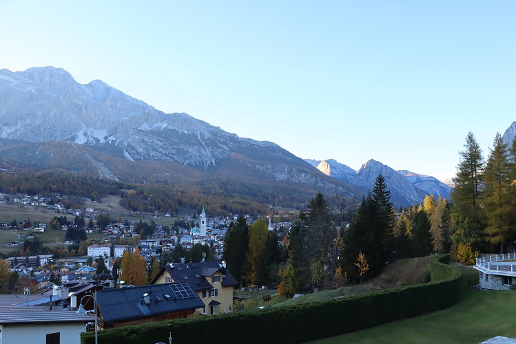 Al centro uno splendido silvestre e in alto la stazione della funivia. Fra loro la parete inospitale del Monte. Torniamo sui nostri passi o quasi (è piacevole girovagare fra i tanti sentieri che si intrecciano fra loro, quando il posto e soprattutto la pendenza lo consentono). Acero di monte neonato, altri ce ne sono in giro anche adulti. Ma come andrà a finire fra questi due così vicini?C’è tempo per un ultimo sguardo ravvicinato prima di uscire dal bosco.E quasi senza soluzione di continuità siamo fuori dal lariceto. Una fugace visita al giardino dell’Hotel dal quale siamo partiti e poi lo sguardo riposa sull’ampia valle occupata dall’abitato. Il Sole ha completato il suo arco diurno lasciando le Tofane nella penombra.Campanile e Basilica dei Santi Filippo e Giacomo.