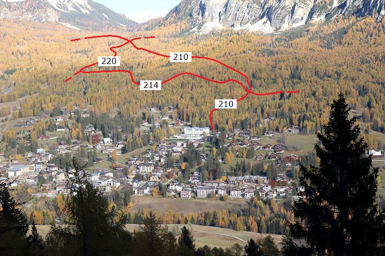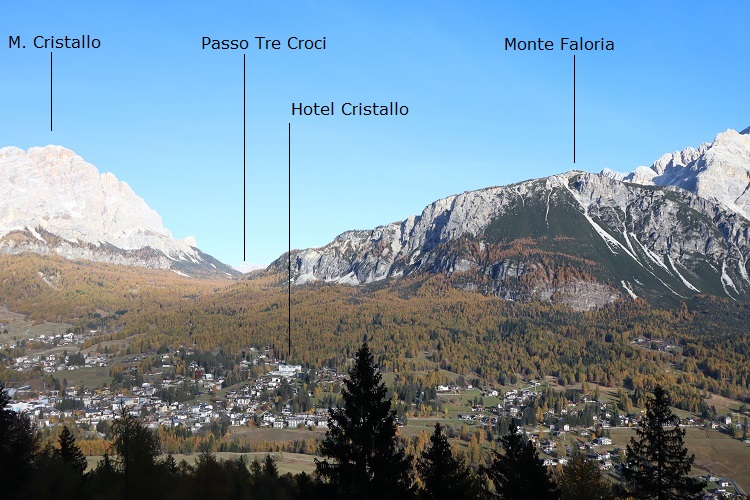 Buona parte dell’abitato di Cortina d’Ampezzo è adagiata sulle pendici del Monte Faloria, è da qui che si gode la migliore vista sull’ampia valle omonima e sul massiccio delle Tofane. Basta uscire dall’abitato salendo in direzione est per imbattersi in qualcuno dei numerosi sentieri che attraversano trasversalmente il Faloria in un vastissimo lariceto, che si estende quasi ininterrottamente dalla frazione Zuel a sud al Passo Tre Croci a nord.