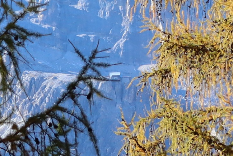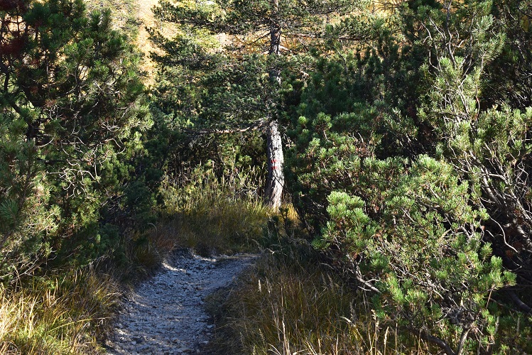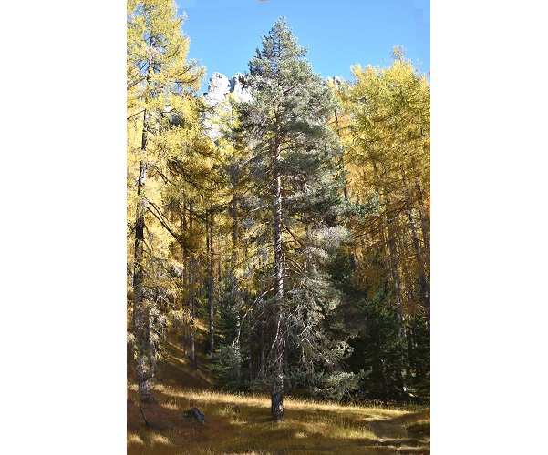 Il sentiero che seguiremo (segnavia 210) ha inizio nei pressi dell’Hotel Cristallo, al centro nella foto.Ma prima di partire volgiamoci a ovest verso l’imponente massiccio delle Tofane. La foto è di un’alba di fine ottobre, visibile il contrasto fra le cime illuminate (da sinistra: Tofana di Rozes, di Mezzo, di Dentro) e l’ombra del Faloria alle nostre spalle. Il sentiero si immerge da subito nel bosco, salendo in forte pendenza.Ben presto raggiunge una vasta radura dove sorgono manufatti dell’acquedotto. Lo spiazzo permette di sbirciare oltre il bosco. Uno squarcio nel fitto delle cime mostra la Tofana di Mezzo. Stazione Ra Valles – Particolare. Ora il sentiero procede in quota ed è molto meno faticoso.Qualche peccio lo abbiamo già incontrato, non sorprende vedere un Pino silvestre alto e slanciato: i larici con la loro chioma gentile lasciano passare la luce che permette ad altre specie di prosperare.Il sentiero sale ancora e compaiono i primi mughi, gradualmente i larici lasciano il posto ai pini e ben presto ci faremo strada in un groviglio di tronchi e rami ad altezza d’uomo. Strobilo di mugo: colore rossastro, umbone grigio, mucrone appena accennato. Ci mettono ben tre anni a maturare. Caratteristici rametti.Aghi corti e spessi in fascetti di due.Berberis vulgaris, completo di frutti e rametti spinosi. Più giù ne incontreremo altri.Ora lo sguardo può innalzarsi al di sopra della vegetazione. Larici solitari caparbiamente attaccati alla parete (quelli che Mario amava particolarmente), ancora qualche silvestre e la macchia quasi uniforme di mughi che più su cede soltanto alla roccia.