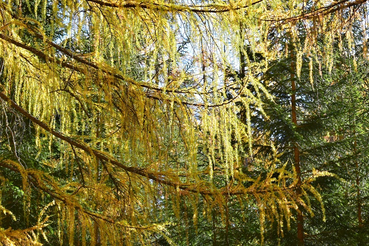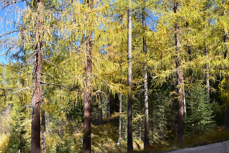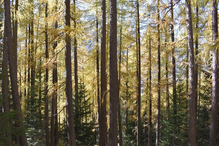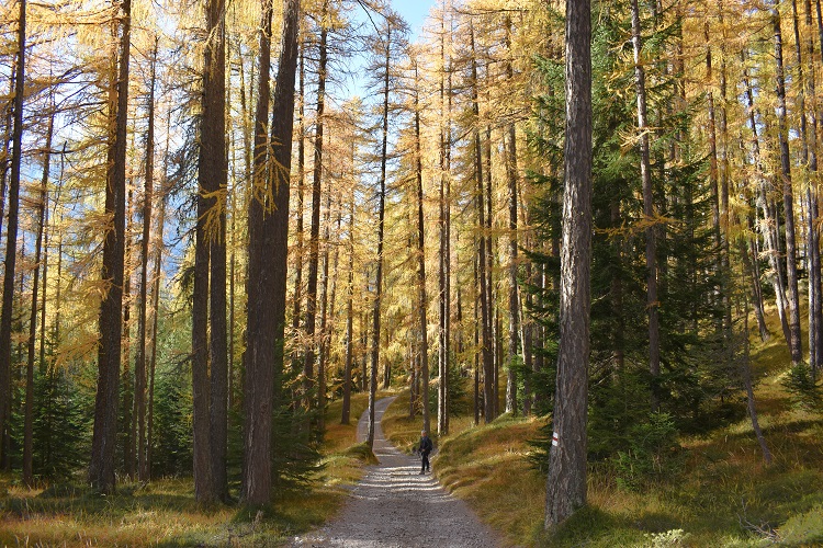 D’oro il tramonto in un bosco di larici, noi sul sentiero.