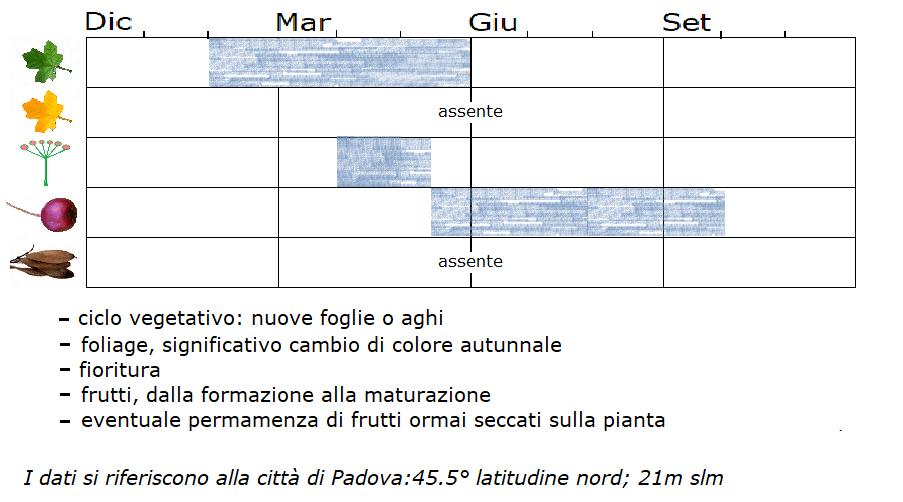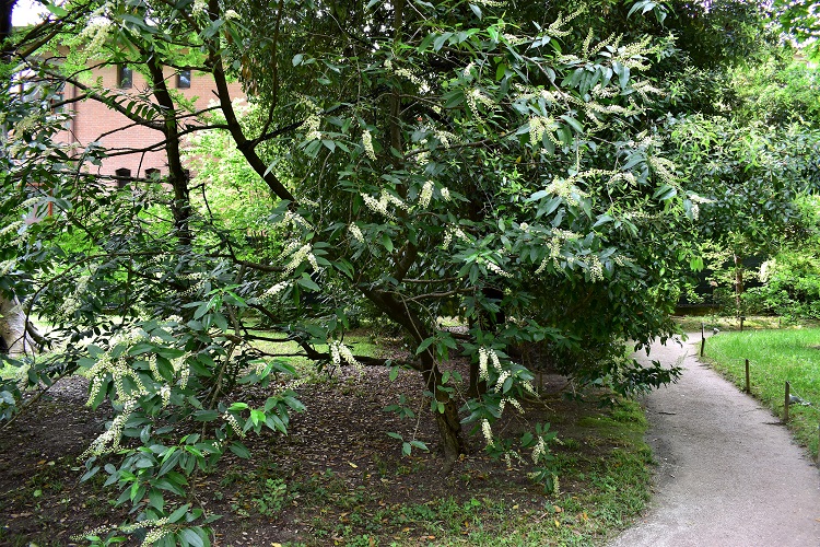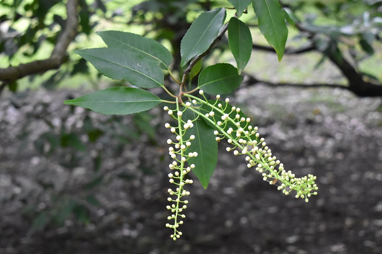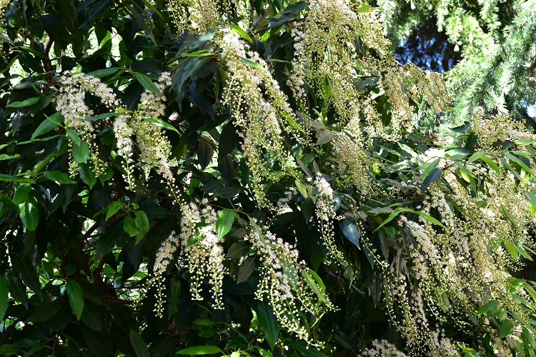 Fenologia minima: risveglio vegetativo, fioritura, fruttificazione.Areale di origine (native range), una ristretta area geografica: parte occidentale della Penisola Iberica.Il periodo vegetativo comincia sin da febbraio e si protrae fino in maggio. Foglia allungata di un bel verde profondo e nervature più chiare, picciolo proporzionato e con caratteristica scanalatura, bordo a piccoli denti, vertice appuntito e base elegantemente arrotondata.Pagina inferiore pallida con nervatura primaria a sbalzoFillotassi alterna e giovani rametti rossi.Lunghe e sinuose infiorescenze a grappolo… …Forse il più classico dei grappoli. Nella foto facile distinguere l’asse centrale, i boccioli con peduncoli pronti a distendersi e le brattee protettive.Fiore simile a quello del cugino Lauroceraso: simmetria pentagonale, petali candidi e saldati nella parte inferiore a formare un tubicino (tubo corollino) colorato d’arancio; stami sporgenti e numerosi (tre per petalo) che circondano il lungo stilo. Stigma giallo e bitorzoluto.Fioritura abbondante e spettacolare con le infiorescenze che si dipartono un po’ in tutte le direzioni, ma in prevalenza verso il basso……formando, in certi esemplari, spumeggianti cascate.Fiori appena fecondati in giugnoDrupe oviformi che maturando diventano dapprima rosso fuoco e poi violaceeLa corteccia è grigia liscia e sottile……con lenticelle ellittiche disposte per righe orizzontali.Cresce, da bravo arbusto, con molte ramificazioni sin dalla base o talvolta da piccolo alberello. Nella foto due esemplari che vivono al Parco Iris.Ma se non gli vengono tagliati i rami bassi ha aspetto più compatto. Nella foto un altro esemplare nello stesso Parco.Se lasciato in pace, come qui in un giardino privato in provincia di Vicenza, può assumere anche grandi dimensioni. Diversamente dal lauroceraso può raggiungere anche un’altezza di quindici metri.L’individuo dell’Orto, bello ed elegante.Arbusteto di Agripolis, colto in piena fioritura.Giardino privato in Via Monte Grappa.