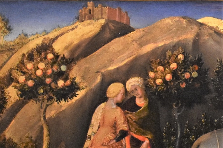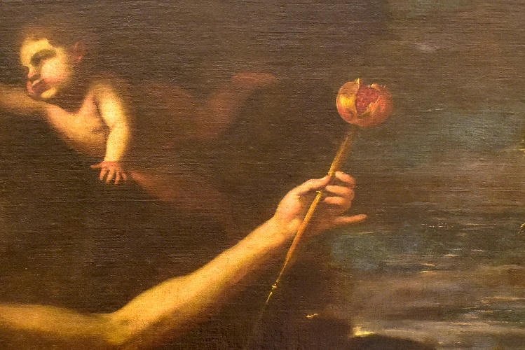 L’abbondanza di semi racchiusi in uno scrigno dalla struttura complessa e misteriosa indica fecondità. Mentre il colore allude al martirio di Cristo, e proprio a quell’orizzonte per ora lontano sembrano rivolti gli sguardi dei due protagonisti. Alcuni angeli sono invece un po’ distratti.