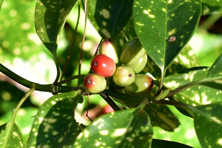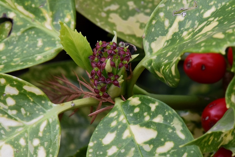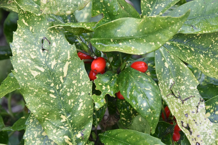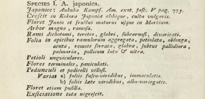 Aucuba japonica Thunb. Nome assegnato da Carl Peter Thunberg (allievo di Linneo all’università di Uppsala) in Nova Genera Plantarum, Parte terza, Uppsala, 1783 (un registro pubblicato dal 1871 che elencava nuovi generi). Thunberg ha studiato nei paesi di origine sia la flora africana sia quella giapponese, pubblicando numerosi volumi sulle specie di quelle regioni. Uomo dalla storia lunga e affascinante tanto che se ne potrebbe fare un film.