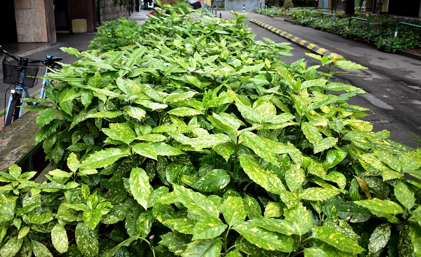 Aiuola in Riviera Mugnai, dalla parte di Via MatteottiGiardini dell’ArenaVista su un esemplare isolato dal Ponte Pontecorvo, un giardinetto al risveglio primaverile. La pianta tollera bene l’ombra: una risorsa per quanti progettano giardini.Via Palestro, unico caso in città (che io conosca) di individuo più alto di due metri. Purtroppo non c’è più a causa di lavori di ristrutturazione (Aggiornato in Settembre 2023).Le foglie sono di un verde brillante e profondo,… …spesso portano macchie dorate più o meno pronunciate. La pianta nasce monocroma, è la presenza di un virus, Aucuba bacilliform, la causa delle macchie gialle.La pianta è sempreverde ma mai monotona; molto interessante, ad esempio, è il risveglio vegetativo, quando le nuove foglie assumono tonalità più delicate. Nella foto in marzo.La forma delle foglie è allungata (lanceolata) con radi denti poco pronunciati e appuntiti, base e vertice acuti, picciolo proporzionato, consistenza coriacea.La pagina inferiore è molto più chiara e con venature evidenti.Ma si diceva delle drupe. Nel 1783 John Graeffer, un allievo di Miller, il Giardiniere di Chelsea, poi giardiniere a sua volta alla Villa di Caserta, introdusse in Europa (leggi Inghilterra) la pianta. Ma erano tutte femmine e quindi niente bacche. Ci volle uno dei viaggi di Fortune per far arrivare in occidente un maschio, con grande soddisfazione di tutti. (Per i particolari di questa storia avvincente vedi qui) Drupe di un paio di centimetri, rosso brillante; poca polpa e tutto semePassano l’estate a crescere sotto forma di olive verdino, poi verso dicembre cominciano ad arrossareE allietano la pianta per tutto l’inverno fino a tutta la primavera. In realtà la cosa è più prosaica: i giardinieri le potano in abbondanza tagliando i rametti terminali e bisogna cercarle faticosamente tra le fitte fronde.Questo è lo spettacolo più comune. La foto è presa ai Giardini Treves nel Marzo di quest’anno. Il vialetto in una foto a campo più largo in Aprile 2019. Corre a mezza costa della montagnola del Tempietto.Gemma apicale, semischiusa già in dicembrePorta tutto al suo interno: foglie e infiori.Infiorescenza a pannocchia. Nella foto fiori maschili in marzo.Le infiorescenze femminili sono più piccoleFiori a simmetria quaternaria (non delle più comuni) con petali rossoviolaceo più o meno intenso. I fiori maschili portano quattro antere gialle su breve filamento viola.Fiore femminile con tozzo pistillo e stigma appiattito.Ricettacolo pelosetto. La faccia inferiore dei petali è gialla.Eccezionale fioritura di un maschio nel vialetto della moderna entrata dell’Orto.Prima di passare ad altri luoghi, ci concediamo questa foto di riepilogo. I giardinieri piantano femmine e maschi vicinissimi gettando nel panico il Cacciatore di Alberi…Macchia in Orto. Sullo stondo fusti (stipiti) di Trachycarpus fortunei (uno compariva anche nella foto precedente).Piazza CastelloChiesa di San Canziano, da sempre, a mia memoria, ornata da piante in vaso.Una femmina carica di frutti all’Orto Botanico di Madrid.