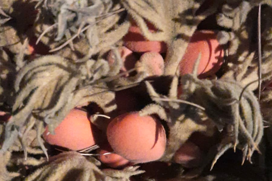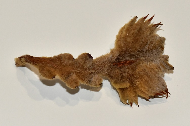 Foglie neonate di Asplenium scolopendriumMa la Nostra ha le uova, mentre le felci hanno un apparato riproduttivo completamente diverso. Nella foto sori a scolopendra di Asplenium scolopendrium. Pianta dioica. Il fiore femminile (o piuttosto bisognerebbe dire la ‘struttura riproduttiva femminile’) ha innumerevoli foglioline dorate che proteggono gli ovuli. Quando tutto è pronto le foglioline si sollevano scoprendo le uova pronte a ricevere il polline.Nel giugno 2025 in quel di Maiori (SA) sono finalmente riuscito a mettere le mani su una fogliolina con i suoi ovuli, i rigonfiamenti a sinistra nella foto.Dalle aperture in cima entra il pollineVista dorsale.Ovuli grossi qualche centimetro e dal colore rosso aranciatoUn paio di settimane dopo gli ovuli cominciano la maturazione. Tutti, pure quelli non fecondati, e anche in questo somiglia al ginkgo. Uovo in maturazione. (Questa foto e tre delle precedenti le devo alla cortesia di Nicola C.) L’apparato riproduttivo maschile ha, lui sì, l’aspetto di una pigna (strobo) con miriadi di squame avvolte a spirale attorno ad un asse centrale. Quando è pronto la temperatura al suo interno sale (in un sussulto d’amore) e offre a vento e insetti il polline.Frutti (in realtà semi) dell’anno precedente.Le foglie sbucano direttamente dal sommo del troncoOsservando da vicino si distinguono fasce oblique in corrispondenza dei piccioli troncati, segno che la crescita segue un andamento a spirale.Le foglie sono composte: un rachide lungo e coriaceo porta attaccate quasi senza picciolo numerosissime foglioline.Queste hanno vertice pungente che si piega verso il basso; sono lucidissime, rigide, di colore verde intenso. Picciolo munito di spine. Le nuove foglie si preparano lungamente a spuntare avvolte in una fitta peluria, poi schizzano su e velocemente diventano adulte.