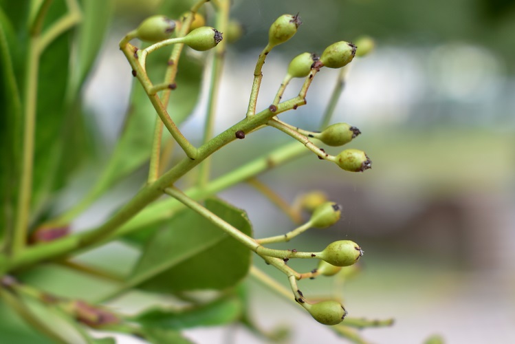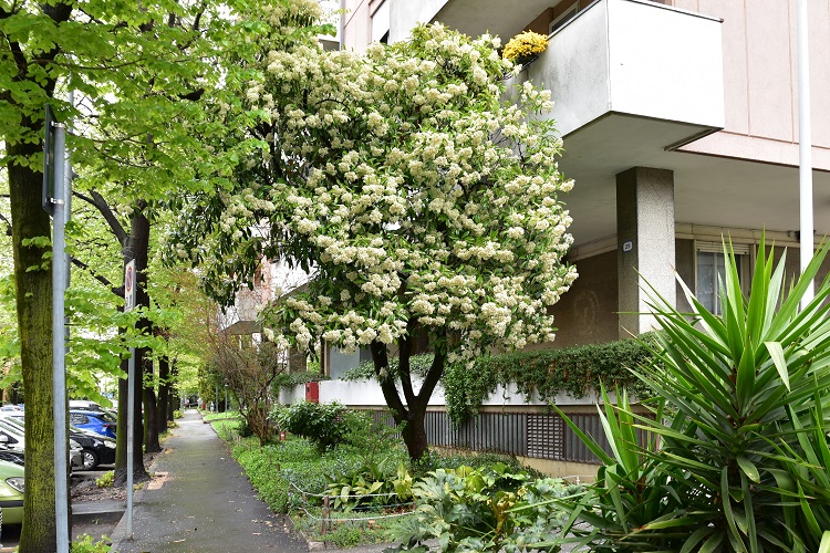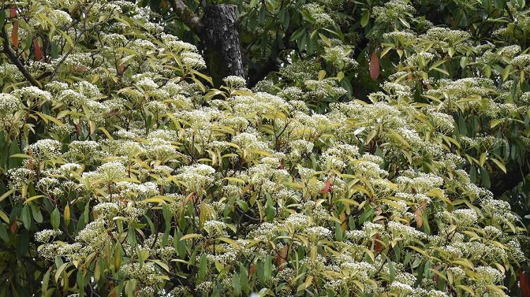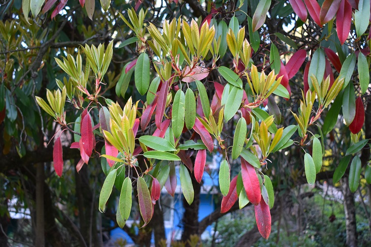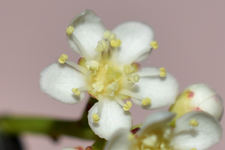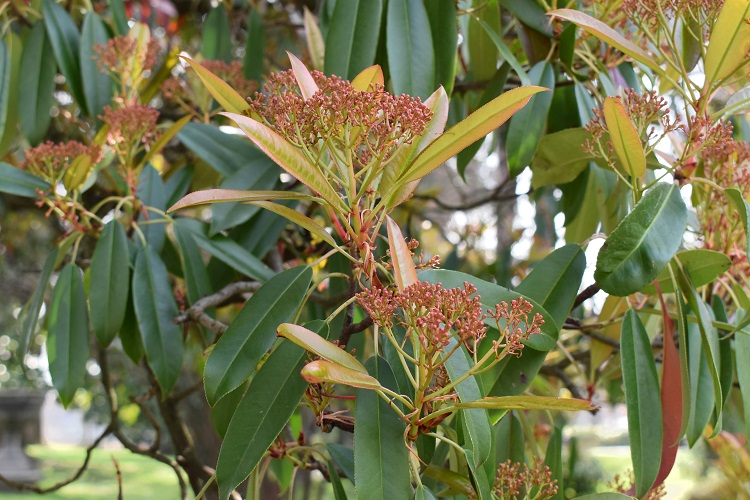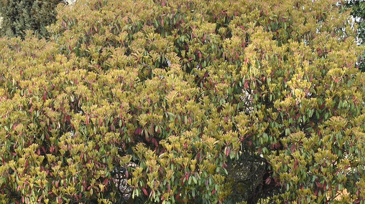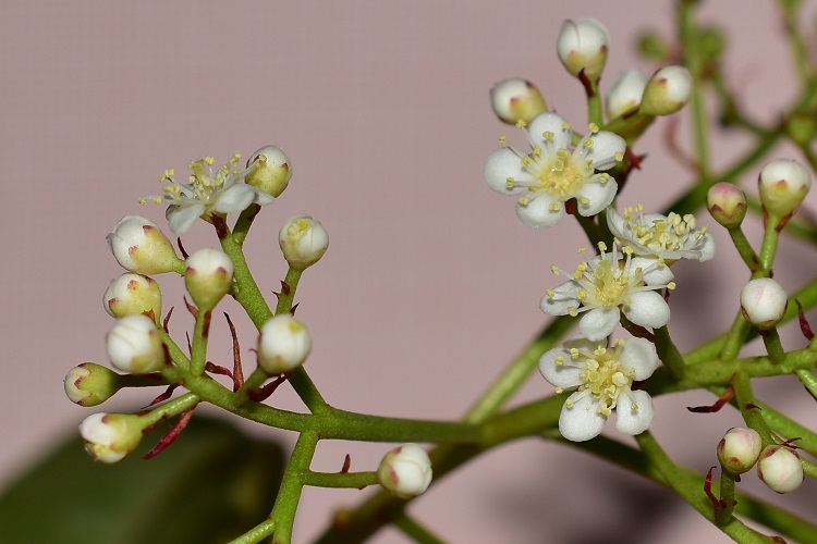 Marzo, foglie nuove non ancora verdi e vecchie da qualche tempo vermiglieFoglia alquanto allungata, acuta in punta e leggermente arrotondata alla base; bordo finemente seghettato, con denti più o meno evidenti a seconda dell’esemplare. Lungo picciolo dal colore più chiaro come la pagina inferiore.Fillotassi alterna; un po’ disordinata. In questo rametto occorrono tre foglie per completare un giro.Le foglie sono lucide, consistenti e coriacee; il picciolo si piega plasticamente sotto il loro peso e i rami, specialmente quelli terminali e più esterni, assumono un caratteristico andamento arrotondato. Che asseconda e accentua la globosità della chioma. Nella foto esemplare al Giardino Alicorno.Già in gennaio si schiudono le grosse e rosse gemme, la maggior parte delle quali porta assieme foglie e fiori.Boccioli in marzo. L’infiorescenza fra corimbo composto (un corimbo di corimbi) e pannocchiaNumerosissimi piccoli fiori bianchiDisposti i pannocchie a loro volta raggruppate in grandi cuscini bianchi.Cinque petali corposi e tondeggianti e cinque sepali rossicci in punta.Numerosi stami dalle antere giallee due, a volte tre, stigmi saldati alla base La fioritura, come ormai si sarà capito, è spettacolare. Foto, Giardini dell’Arena.Orto Botanica, Porta Sud.Giardino privato in Via Tirana