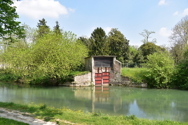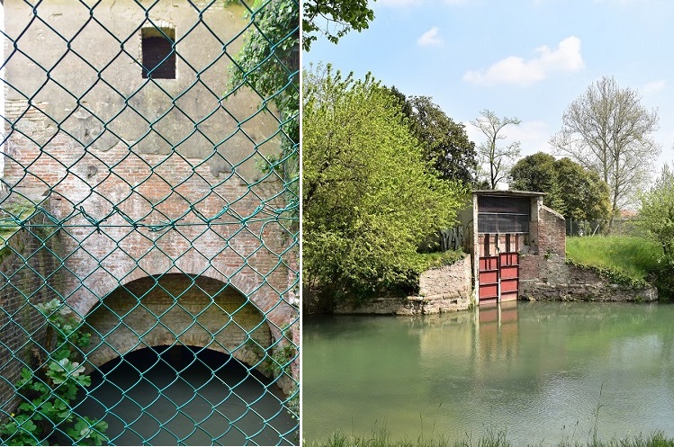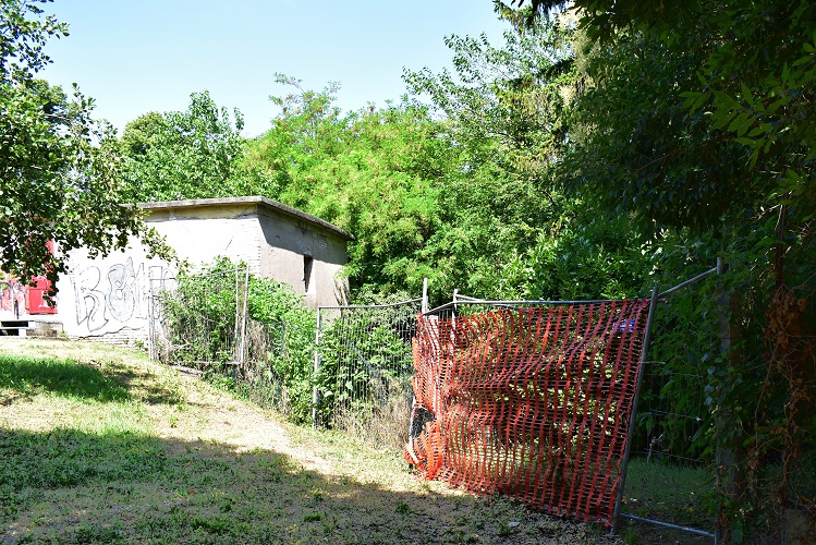 Le due zone sono ora separate da una recinzione provvisoria e precaria, ma non è dato sapere se avranno un futuro comune. La costruzione sulla sinistra (b) è la chiavica del Canale Alicorno.A sinistra la facciata sul Canale Alicorno, a destra quella sul fiume che porta la paratoia per la regolazione del flusso. Collegare le due aree potrebbe essere un’occasione per realizzare un corridoio ecologico (transito di specie animali e vegetali) lungo la riva destra del fiume.L’argine del Bacchiglione e in fondo la chiavica. In primo piano ontani (Alnus glutinosa) (9) di certo spontanei. A destra la recinzione del Giardino.