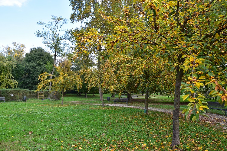 Il Giardino ospita alcuni alberi di Sant’Andrea (Diospiros lotus) (5); uno dei suoi tanti pregi poiché la specie è piuttosto rara in città. Un maschio dalla curiosa base. Frutti maturi in novembre, simili a quelli del cachi, ma molto più piccoli.Anche le foglie, dalla forma gradevole e colore intenso, sono belle da guardare.Un’ampia area ad nord dei lotus è lasciata a prato. Di recente è sede di una bellissima collaborazione fra Comune e UniversitàNon si sfalcia, lasciando crescere l’erba a beneficio delle apiIncredibile la quantità di fiori che si incontrano.In questa parte del Giardino è presente anche un certo numero di tassi (Taxus baccata) (2), alcuni vetusti. Conifera molto amata forse a motivo della sua doppia natura di albero della vita, in quanto sempreverde, e albero della morte, perché velenosissimo in tutte le sue parti… …tranne nell’arillo che avvolge il seme.Uno un po’ più giovane cresce sotto i grandi pioppi, nella regione centrale.Un importante Acero montano (Acer pseudoplatanus) (1) forse il più bello in città. Lungo il confine est vive una Glicine (4) dalla impressionante fioritura (aprile). Il fiammeggiante acero giapponese è di un giardino privato.Pioppo grigio (7) di dimensioni eccezionali, come solo loro sanno assumere. Speriamo si mantenga in salute vista la sorte toccata ai grandi alberinegli ultimi tempi.