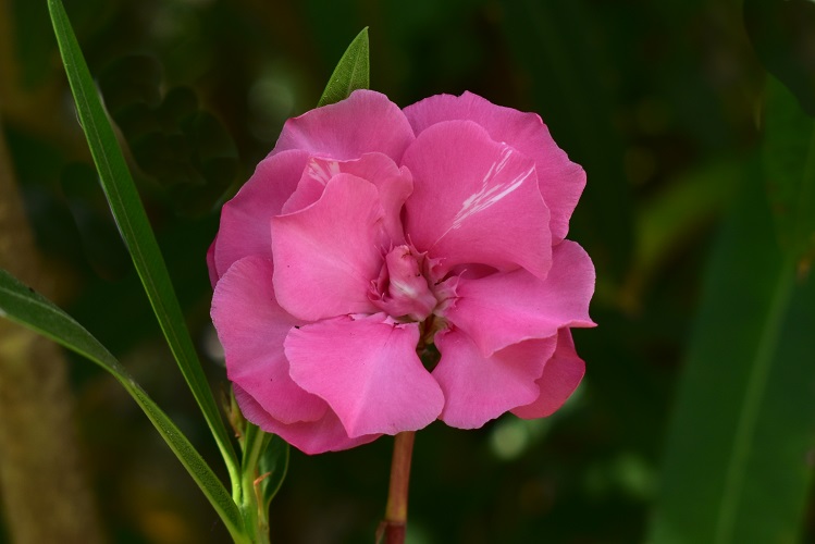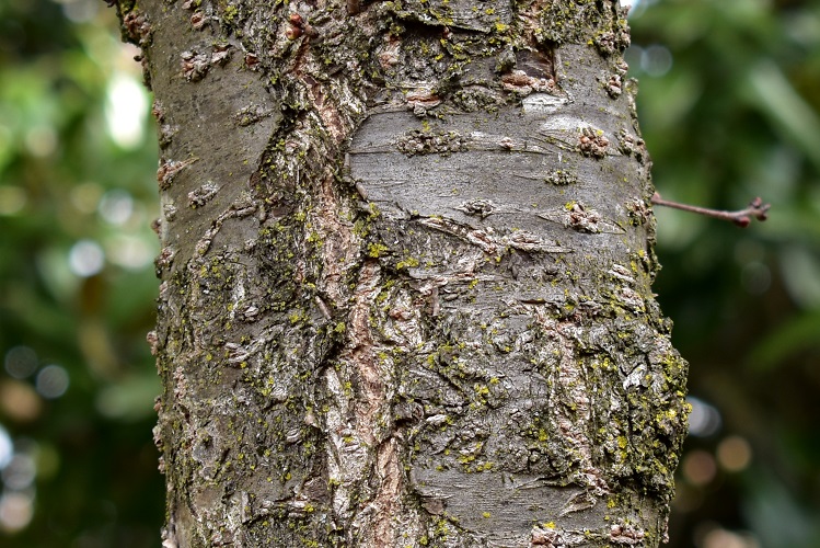 Foto da GoogleMyMaps. Il Giardino ha l’entrata a sud da Via Cossa (“a“, sulla piantina), sul lato ovest è delimitato dal Bacchiglione che oltre il manufatto (b) prende il nome di Tronco Maestro, a nord confina col complesso del Bastione Alicorno (c, d), a est civili abitazioni. L’entrata da Via Cossa. Imponente la massa arborea, gli alberi più alti sono pioppi grigi (Populus x canescens) (7). Giovani frassini minori (Fraxinus angustifolia) (12) occupano piccole aiuole del parcheggio.Attraversata l’entrata imbocchiamo il sentiero in direzione nordest, subito sulla destra un gruppetto di peri cinesi (20) ci allieta con la fioritura marzolina. Sullo sfondo i grandi pioppi ammirati da Via Cossa.I fiori dai petali candidi, le antere viola e i boccioli macchiati di rosa, sono bellissimi. Oltre i peri sono presenti molte piante interessanti. Un oleandro (19) di notevoli dimensioni nell’angolo sudest, colto fiorito a fine giugno. Fiori doppi. Più fucsia che rosa, per questo da lontano ha quell’aspetto ambiguo.Ancora fucsia con la fioritura di un giovane Crataegus levigata Paul’s Scarlette (14)Uno dei più generosi in città.In questa parte di Giardino ci attende una sorpresa: un rarissimo, per Padova, Prunus padus(16). Ciliegio dai fiori a grappolo, dall’infiorescenza così perfetta da sembrare finta. Che io sappia ci sono solo due esemplari i città, l’altro è nel recente arbusteto dell’Orto. Suoi sono i frutti dalla più classica delle disposizioni a grappolo.Il delizioso fiore di un giovane Prunus subhirtella (18).La corteccia.In questa grande aiuola di sudest compaiono anche tre grandi alberi di specie ben note a questo blog: un Platano comune (13), nella foto, un Cedro dell’Himalaya (15) e una Magnolia dai fiori bianchi (17).In una siepetta ai bordi dell’aiuola una vera rarità per Padova: Osmanthus x burkwoodii. Fiori profumatissimi e graziosissimi.