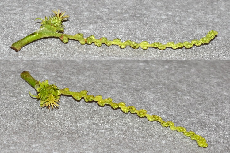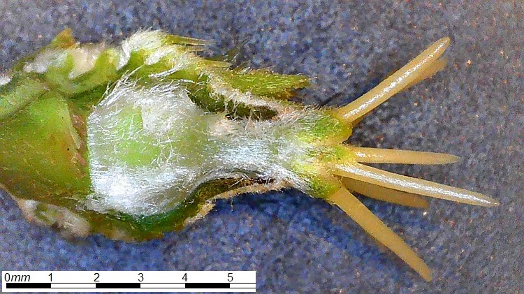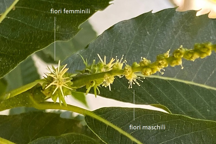 brullo io te vidi; e già per ogni ripa erano colte tutte le vïole, e tu lasciavi ai cesti ed alla stipa tutto il tuo soleFiore di cotogno. Primi di aprile.Violette in marzo, azzurrano il fianco del sentiero (greppo) sul Monte Grande (Colli Euganei).Foglie novelle in aprileFillotassi alterna. Foglia allungata, vertice acuto e base arrotondata; venature dritte, fitte, parallele; bordo seghettato. Denti osservati da vicino: terminano con un morbido aghetto.Pagina inferiore più chiara e con venature in rilievo.Tardi rinverdisce e tardi (giugno) fiorisce. Ma lo spettacolo è suggestivo, le enormi piante si ricoprono di pennacchi dorati.Infiorescenze, molto spesso bisessuali, in lunghi e robusti amenti che portano nella parte superiore gruppi (glomeruli) di fioretti ‘nudi’ dalle gialle antere, e inferiormente gruppi di fiori femminili. (Foto: cortesia di Andrea C.)Ingrandimento di un glomerulo di fiori maschili. I singoli fioretti distendono le minuscole antere inizialmente attorcigliate.Amenti dorati di soli fiori maschiliNella parte inferiore gruppi di due o tre fiori femminili. I segmenti bianchi che escono radialmente sono stigmi, ogni centro di irradiazione è un singolo fiore (nella foto ognuno dei tre gruppi di fiori ne porte tre). (Foto: cortesia di Andrea C.) Le strutture verdi, alla base del gruppo di fiori femminili, si trasformeranno in ricci spinosi. Nella foto i glomeruli di fiori maschili sono in boccio.In primo piano gruppetto di fiori femminili, ricoperto da un rivestimento di brattee e aghi carnosi: il futuro riccio.I lunghi e appuntiti stigmiSingolo fiore femminile, una volta asportato l’involucro e separati fra loro. Si distinguono il breve stilo al centro, e l’ovario supero a sinistra.Infiorescenze in maggioCastagne nel loro riccio. Tutti le conosciamo.Completano la maturazione in ottobre, e nel frattempo stemperano il verde scuro della chiomaPrimi di settembre. Il riccio è una cupola, potremmo dire una pseudo capsula, che si apre in due o quattro valve, mentre i frutti all’interno sono noci.Castagneto sul Monte Rosso (Colli Euganei, segnavia 16). Non è in buono stato, nessuno raccoglie i frutti e lo stanno trasformando in ceduo.Catasta di tronchi di castagno. Monte Grande, segnavia 14, Colli Euganei.Queste piante sono invece curatissime e economicamente preziose. Piantagione di castagni nel comune di Soriano nel Cimino (VT).Bosco di castagni lungo il sentiero della Valle del Sambuco, Ravello (SA). Anche queste piante danno ottimi frutti.Negli esemplari giovani e nei rami nuovi la corteccia è liscia e sottile. Poi si fessura in lunghi solchi longitudinali sufficientemente distanziati fra loro da lasciare pressoché intatta la corteccia interposta. Pianta giovane: corteccia lisciaLe creste restano appiattite……ma non perfettamente lisce, si tagliuzzano orizzontalmente.La foto mostra come il fenomeno si verifichi a partire dal basso, qui l’espandersi del fusto provoca le screpolature assenti nella parte superiore. La zona di transizione è involontariamente segnalata dal nastro rosso e bianco.