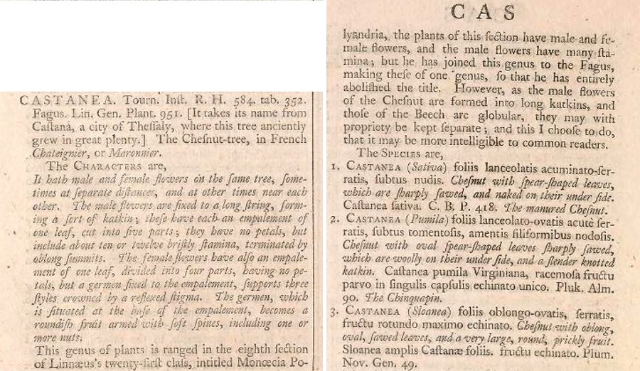 Fagaceae Castanea sativa Mill. Nome assegnato da Philip Miller nel suo celeberrimo Gardeners Dictionary, Londra, 1768, ottava edizione, al numero 1 del set di pagine denominate con la sigla CAS-CAS. Miller, giardiniere di Chelsea, fu fiero oppositore della nomenclatura linneana, di cui ritardò l’adozione in Inghilterra per decenni. Poi cedette vinto dalla realtà dei fatti, e nell’ottava edizione del Dictionary finalmente si adeguò.