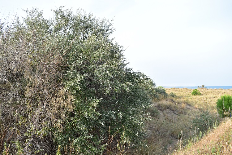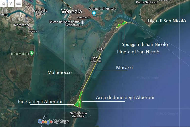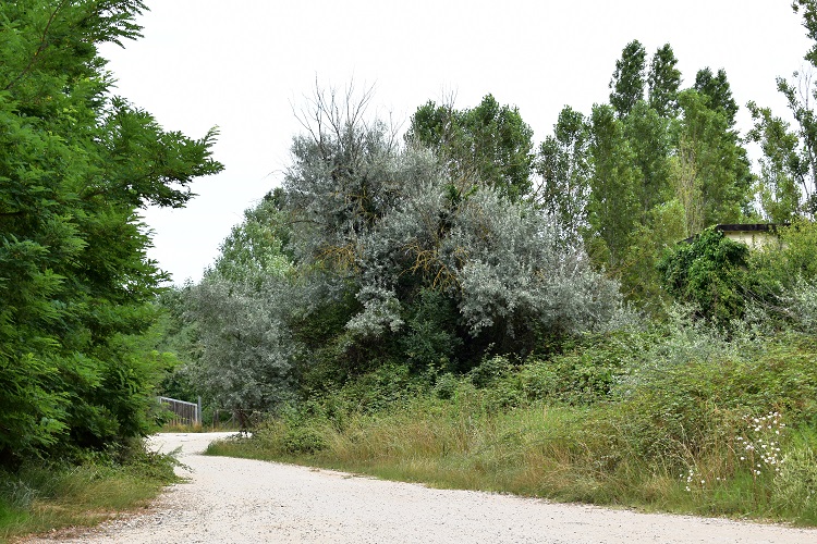 Le foglie non sono molto grandi ma compaiono numerosissime sui rametti e orientate in modo vario tra loro, così rami, rametti, e ramicelli sembrano punteggiati di lucenti stelline. Sullo sfondo, Santa Giustina.Un luogo dove trovarne numerosi, facili da osservare e completamente naturalizzati (circostanza sempre esaltante per i cittadini) è il Lido di Venezia. Nella foto i Murazzi, verso la Spiaggia degli Alberoni.Isola del Lido di Venezia, in evidenza le aree citate nel post. Fonte GoogleMyMaps, modificato.Pineta degli Alberoni, in maggio. Un compendio di tonalità argentineFoglia allungata, bordo intero, base e vertice arrotondati. Somiglia all’ulivo, ma forse maggiormente a Salix alba. Pagina superiore verde scuro con nervature evidenti e ricoperta di peluria.Pagina inferiore con fitta peluria argentata.Squamette bianchicce a foggia di anemoni di mare. Pagina inferiore, la trama s’infittisce…Anche i giovani rametti sono ricoperti da squamette.Fillotassi alterna con foglie ruotate di un angolo compreso fra novanta e centottanta gradi: improbo scovare una regolarità.La fioritura è maggiolina quando ormai le foglie sono formate da un pezzoGialli fioretti isolati o a gruppi di due o tre compaiono alle ascelle delle foglieDolcemente profumatiFiore privo di corolla. È il calice che la simula: un tubicino a sezione quadrata, che termina con quattro denti triangolari, argentato all’esterno è giallo smagliante internamente. Stigma arricciato a pastorale e ricoperto di sostanza attaccaticcia Quattro antere gialle e amaranto con due sacche polliniche separate longitudinalmente.Volute e sinuosità: la danza del pistillo.Filamenti aderenti alla parete interna del caliceBocciolo. Il ricettacolo è inizialmente insignificante, poi cresce e prende parte attiva alla formazione del frutto.Fiore fecondato con ricettacolo ingrossato e allungato.Sezione dell’ovario. A destra il fiore secco.Luglio, esattamente un mese dopo. I frutti sono drupe allungate, inizialmente verdognole e pruinoseIn ottobre cominciano ad arrossarsi, ma conservano ancora il calice Poi diventano ocra e perdono il calice. Picciolo breve.Le foglie non ingialliscono, ma semplicemente si accartocciano e aspettano il vento per cadere.La pianta è munita di robuste spine, che meglio si possono osservare quando è spoglia. I rametti crescendo perdono a poco a poco l’argentatura e lasciano vedere numerose lenticelle. Gennaio, gemme piccole, rotonde, argentate.La corteccia inizialmente liscia e grigia……si screpola in lunghe e strette strisce molto tormentate; allorché dai tessuti sottostanti emerge un colorito rossastro.Lido di Venezia, Spiaggia della Diga di San NicolòRobinie, olivi di Boemia e pioppi presidiano l’imbocco del sentiero che conduce alla Diga.Il complesso di dune in formazione che separa la spiaggia degli Alberoni e la Pineta. Pini, perlopiù marittimi, e Elaeagnus si dividono lo spazio.In febbraio.Novembre. Murazzi, Lido di Venezia, sullo sfondo il campanile di Malamocco. Esemplare di notevoli dimensioni.Scenografica apparizione di Elaeagnus angustifolia all’estremo di un laghetto in un giardino privato, Ancignano (VI)Giardini della Place de la Tour de Saint Jacques, Parigi.