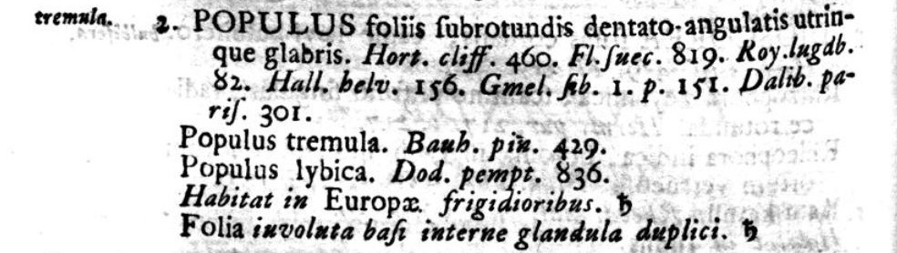 La pagina 1034. Pianta collocata fra le Dioecia Octandria (dioiche a otto stami). Foglie arrotondate, con denti angolosi e ovunque glabra. Ha nome Populus tremula sin dai tempi di Bauhin.Fenologia minima: ciclo vegetativo, fioritura, fruttificazioneAreale di origine (native range). Esteso sia in latitudine sia in longitudine per tutto il continente euroasiatico.
