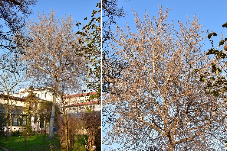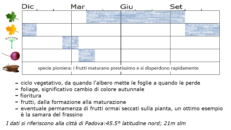 Lunghissimo picciolo e lamina quasi perfettamente circolare. Il bordo è munito di radi denti, ma potrebbe dirsi anche semplicemente crenato. Le nervature secondarie formano un angolo molto stretto con la principale. Per aumentare l’effetto ‘tremolio’il picciolo è appiattito e disposto perpendicolarmente a lamina e guaina Nella foto si distingue la torsione del picciolo per orientare la guaina a novanta gradi. Rametto in maggio. Le foglie non sono tutte uguali ma han forma leggermente diversa, forse quello che colpisce di più è la presenza, sui rami privi di fiori, di foglie con apice nettamente acuto.Pagina superiore, maggioPagina inferioreLa pagina inferiore è glabra e molto più chiara (foto in luglio), quasi glauca. Nel colore somiglia molto a quella del pioppo grigio.L’albero ha portamento slanciato, il tronco tende a restare di diametro contenuto e a perdere i rami più bassi.Ama l’acqua. Nella foto un boschetto di tremula presso il Laghetto ai Maronari (Sentiero del Venda, segnavia 9) Febbraio. A sinistra il ‘Laghetto’, in realtà poco più di una pozza, recintato. Ai margini di un bosco di Pinus nigra laricio. Camigliatello (Sila)In città, che io sappia, vive un solo tremula, in Orto; condivide un’aiuola con un’Albizia vicino le vecchie serre.Qui in dicembre. Il foliage di questa specie comincia in ottobre e si protrae per almeno tre mesi.Le foglie si colorano d’oroUn gruppo di tremula al Jardín Botánico Histórico – La Concepción, Malaga. Febbraio, hanno ancora tutte le foglie, ma siamo in Andalusia…Infiorescenze femminili in amenti pelosiI singoli fiori, brevemente peduncolati, hanno pistillo a fiaschetta sormontato da stigma giallognolo e sono protetti da una brattea sfrangiata.Anche le infiorescenze maschili sono in amenti pelosi. Rosse antere emergono dalle lunghe brattee profondamente e finemente sfrangiate.Il singolo fioretto ha una struttura alquanto articolata: una brattea sfrangiata e pelosa ricopre una seconda brattea più chiara (una sorta di pseudo calice), la quale brattea porta gli stami.La copertura principaleIl fiore col suo pseudocalice, di profilo e in pianta. Si distinguono sottilissimi filamenti che portano le antere (inizialmente rosse, poi violacee).Utile un diagramma fiorale.La pianta è dioica, come tutti i pioppi (anzi come tutte le salicacee); i maschi prendono il colore dalle rossissime antere. Nella foto il tremula dell’Orto, quando fra febbraio e marzo rivela il suo sesso.Infruttescenze alla fine di marzo I frutti conservano le brattee sfrangiate e cigliate. In cima si riconoscono gli stigmi avvizziti.Maturano presto: fra marzo e aprile. I frutti sono capsule bivalve a forma di birillo All’interno portano semi avvolti in una lanugine bianca (pappo).Una capsula colta all’aperturaMaturazione completata. Sembra un elemento floreale stilizzato di art decò.Seme, piccolissimo, con parte del pappo.La corteccia è grigia, molto chiara, si fessura debolmente in senso longitudinale lasciando ampie regioni intatteDa giovane è liscia; poi compaiono crepe che sembrano disporsi in circolo, ma ben presto prende la forma definitiva.