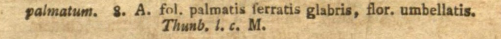 La pagina 911. La descrizione sinteticissima ‘alla Linneo’ recita: foglie palmate, a bordo seghettato, glabre; fiori in infiorescenze a ombrella. Classe 23. Polygamia monoecia (fiori uni e bisessuali sulla stessa pianta).Fenologia minimaAreale di origine – Native range