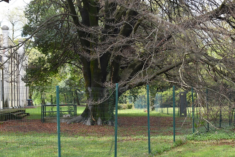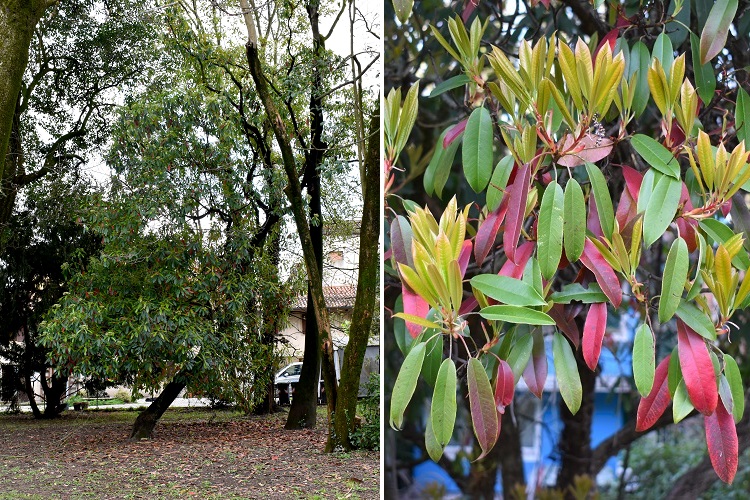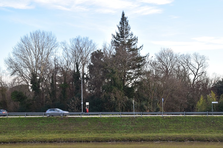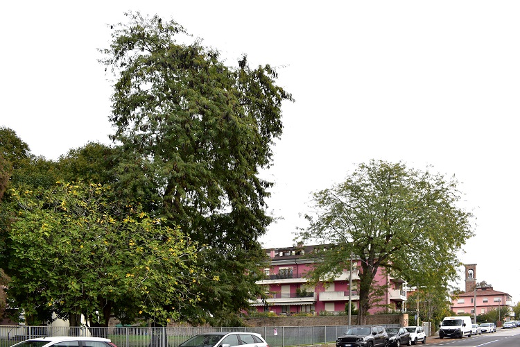Un esemplare veramente notevole, incute soggezione il solo avvicinarsi. Vive oltre una recinzione nel giardino della Scuola Media ‘Stefanini’, che occupa la vecchia dimora degli Sgaravatti.Gli altri due stanno oltre il vialetto, verso Via Piovese. Nella foto, sullo sfondo il Nostro e dietro la scuola. La caratteristica foglia di questa cultivar.Veduta del Giardino verso nord, oltre i faggi fitta vegetazione.
