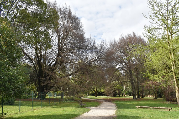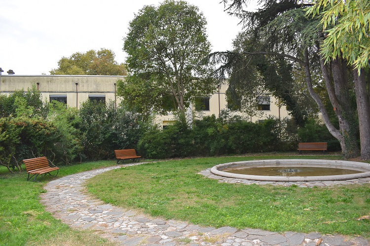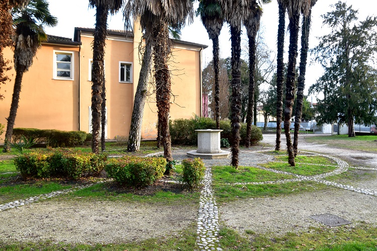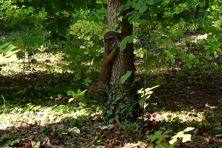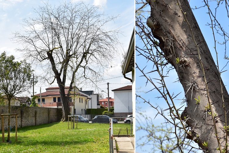 Figura elaborata da GoogleMaps Il Giardino è abitato da numerosi spini di Giuda (2 nella mappa). Nella foto due all’angolo sudovest.Tutti rigorosamente armati.Presso l’entrata vive un gruppo di tre noci del Caucaso (Pterocarya fraxinifolia) (3 nella mappa), notevoli per dimensioni ed età, di certo risalenti ai primi del ‘900. Fa una certa impressione avvicinarsi ai possenti fusti. Vetusta Fotinia (4 nella mappa) a sud dell’area giochi. Una delle tante perle del Giardino è un Cefalotasso (una femmina) (5 nella mappa). Quasi certamente è coetanea dell’esemplare dei Giardini dell’Arena. Si trova vicino all’area giochi; nonostante l’ubicazione delicata non credo rischirealmente: bambini troppo piccoli e sempre accompagnati da genitori premurosi.La specie ha corteccia coloratissima, e il Nostro non è da meno, come mostra la foto presa dopo un temporale.Numerosi sono i tassi (6 nella mappa) che abitano il Giardino, questo splendido esemplare, che vive presso l’entrata, si distingue per l’altezza e il portamento slanciato. Notevole Agazzino (Pyracantha coccinea) (7 nella mappa), per una volta non a guisa di siepe. L’altezza ne denuncia l’età, ma ancora si riempie di melette rossissime che allietano la vista per tutto l’inverno. Suggestiva quinta di cedri dell’Atlante impreziosita dal rosso della corteccia di un Pino silvestre(troppo frettolosamente ucciso nel 2019).Macchia di bambù (Phyllostachys mitis) (8 nella mappa) al risveglio vegetativo in aprile; dietro un splendido Olmo dalle samare gialline.Dicembre. L’Olmo spoglio e a fianco due ligustri carichi di frutti; si distingue sull’estrema destra la chioma di un Pino marittimo (Pinus pinaster).La fontana prospiciente l’ex Semenzaio, si trovava al centro di un piccolo giardino all’italiana. Anche di ligustri lucidi (Ligustrum lucidum) (9 nella mappa) se ne contano parecchi. Nella foto un esemplare, dalla chioma particolarmente folta, che abita a ridosso di Via Piovese e chiude un breve filare di cedri dell’Atlante. Qui siamo immediatamente a nord dell’ex Semenzaio. Questo ligustro, assieme ai due presso l’entrata, è uno dei più vecchi del Giardino. A sinistra un Negundo con le giovani foglie in aprile, e in primo piano a destra il tronco di un notevole Tiglio selvatico.Il vecchio tiglio (10 nella mappa) vive assieme ad altri due compagni; il gruppo è unico per dimensioni e età in città. Altri cordata sono stati piantati, ma tutte cultivar selezionate per crescere poco.Il Giardino ospita uno degli alberi più singolari della città, e anche dei più anziani: un Lauroceraso dal portamento prostrato (11 nella mappa).Il tronco fortemente inclinato è un paradiso per bambini di tutte le età.Dirigendoci verso l’angolo nordovest del Giardino fra aceri, frassini e carpini incontriamo la grande Sequoia (12 nella mappa) che abita questo luogo ricco di piante così importanti. Il fusto è imponente e diritto, privo dei rami più bassi come tipico della specie. Per ammirarla in tutta la sua altezza si deve andare sull’argine sinistro del Canale Scaricatore, giacché le grandi piante che la circondano ne ostacolano la vista.La corteccia spessa, profondamente fessurata e quasi feltrata al tatto.Ritornando verso sud si incontra un altissimo, per la specie, Albero di Giuda (Cersis siliquastrum) (13 nella mappa). Deve essere cresciuto così tanto perché vicino ad altri grandi alberi. Ha per compagno un Ippocastano rosa, anche lui insolitamente alto per la specie. Nella foto entrambi fioriti.Ripercorrendo i sentieri a ritroso guadagniamo l’uscita, non prima, però, di contemplare un gruppo di palme cinesi (Trachycarpus fortunei) (14 nella mappa) disposte simmetricamente attorno a quella che sembra una vera da pozzo. Il tutto dominato da un pino nero cresciuto biforcuto.Lo spazio circostante è suddiviso in dodici settori, suggerendo che la composizione richiami le ore del giorno o forse lo zodiaco. Nulla posso aggiungere poiché non ho trovato documenti o studi in proposito. L’incredibile corteccia del Pino nero.Pubblicato il post, ricevo dalla mia amica Carmen (la Passionaria del Parco dei Faggi) la foto dello scoiattolo che abita il Giardino.