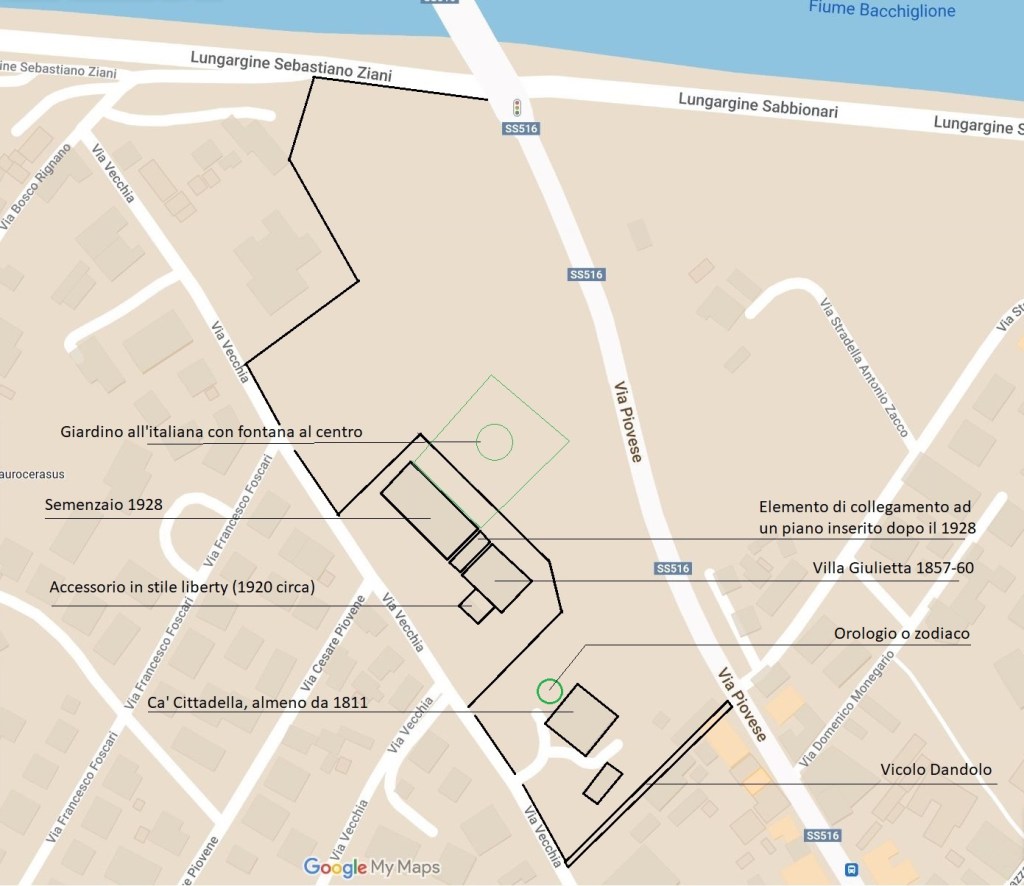 Le prime notizie certe sul luogo (si veda questo link) risalgono a fine ‘700 inizio ‘800, con la presenza di una casa padronale denominata Ca’ Cittadella, dal nome del proprietario.Nel 1855 il fondo diviene proprietà di Leopoldo Ferri che fra il 1857 e il 1860 costruisce una Villa dal sapore mitteleuropeo denominata Villa Giulietta (l’attuale sede della Scuola Elementare ‘Stefanini’). Nel 1927 la proprietà passa a Vittorio Sgaravatti e diviene la sede della società ‘Sgaravatti Sementi’. A nord di Villa Giulietta è costruito, nel 1928, un edificio, dalle agili linee, adibito a deposito per sementi. Oggi sede della Scuola Elementare ‘I. Nievo’.Nel contempo Vittorio arricchisce l’appezzamento di terreno attorno a Villa e Semenzaio di piante pregiate, facendogli assumere l’aspetto di un vero e proprio orto botanico.Nel 1970 il Comune di Padova diviene proprietario di tutti gli immobili, alberi e edifici.I manufatti presenti nel Giardino.