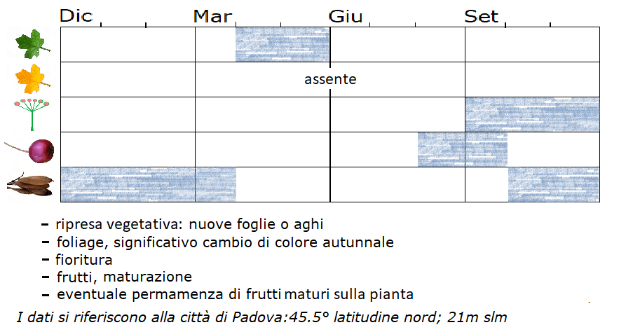La pagina 1026. Descrizione omessa, in compenso sono indicate tutta una serie di località di origine.Fenologia minima. I frutti maturano a fine estate inizio autunno dell’anno dopo la formazione, restano a lungo sulla piantaAreale di origine in verde. In giallo le regioni successivamente colonizzate