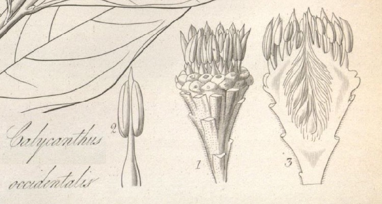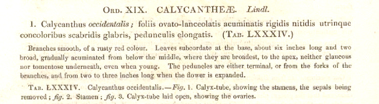 Calycanthus occidentalis Hook. & Arn. Il nome compare per la prima volta in William J. Hooker, Walker Arrnott, The botany of Captain Beechey’s voyage, Londra 1849. Fu scoperto nel corso del viaggio, che si svolse dal 1825 al 1828, sotto il comando del Capitano Beechey, come recita il frontespizio del libro.