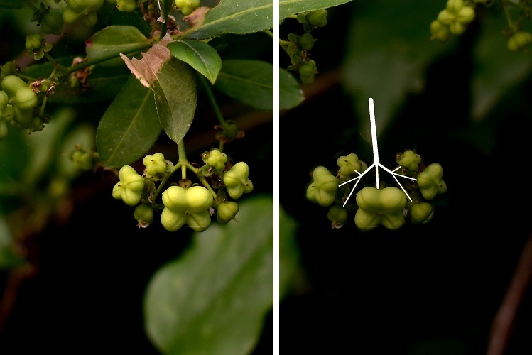 Quattro sacche saldate assieme e attaccate ad un peduncolo sottileCapsula capovolta.Un disegno a chiarimento. Cappello per preti cattolici naturalmente.I frutti permangono a lungo e numerosi; per quanto lo permettono gli uccelli, grandi consumatoriDicembre. Infruttescenze a mazzolini penduli.Tecnicamente si dice infruttescenza cimosa (lo stesso vale per l’infiorescenza). Più esattamente a cima bipara.Spesso si incontra ai margini del bosco. Qui, in settembre, lungo un tratturo dal fondo ricco di sottilissimi sedimenti argillosi (falde del Monte Cimino, VT). A maturazione le sacche si aprono e lasciano cadere semi coperti da un arillo aranciatoIn maggio, a volte anche prima, si ricopre di candidi fioretti che assecondano la chioma mollemente ondeggiante Quattro petali sottili e ben distanziati, su infiorescenze aperte, della cui esatta struttura si è già detto. Quattro stami svettanti alternati ai petali. Al centro, alto e sottile pistillo con base a quattro lobi appena accennati. A guardarlo da vicino sembra fatto di cera, ma con riflessi vetrosiQuattro sepali verdi reclinati verso il ricettacolo Foglie verde brillante. Lamina allungata, vertice e base acuti, picciolo proporzionato. Giovani rametti verde intenso.Fillotassi opposta, con le coppie di foglie ruotate ad angolo retto. Nervature leggermente evidenziate, bordo fittamente seghettato ma con denti minutiPagina inferiore più chiara e opaca; nervature più marcate.Al risveglio vegetativo, in marzo, spuntano i giovani boccioli: bottoncini affastellati gli uni sugli altri in cima a brevi peduncoli.Larve di coleottero del genere Yponomeuta (sulla specie le fonti si contraddicono, forse Y. cagnagella). Quando le larve si svegliano, in marzo, divorano gemme e foglie. Poi la pianta, per fortuna, si riprende, ma immaginate a quale sforzo è costretta.Corteccia liscia e grigio verde, poi diventa decisamente grigiaAnche i rametti, come si è detto, sono verdi. Ma d’inverno diventano grigi. Cresce ad alberello o a piccolo arbusto. Rami sottili ad angolo acuto rispetto al fusto principale, ma presto si inarcano verso il basso. Nella foto un esemplare al bordo del Sentiero Lorenzoni (giro del Venda), località: Case Brombolina.Maggio, Pineta di San Nicolò al Lido di Venezia. La chioma è aperta e rada. Difficilissimo fotografarlo assieme ad altre piante poiché risalta pochissimo sui fondali.Il periodo in cui si fa notare è, come si è detto, alla fruttificazione. Allora ingiallisce o addirittura le foglie possono arrossarsi al pari dei frutti. Ancora la Pineta di San Nicolò.Raro trovarlo isolato, più spesso è parte di siepi. Nella foto presa in novembre il colore rimasto verde scuro lo distingue dai compagni. Argine fra Pontevigodarzere e la Certosa.Un esemplare in Orto che cresce come arbusto.