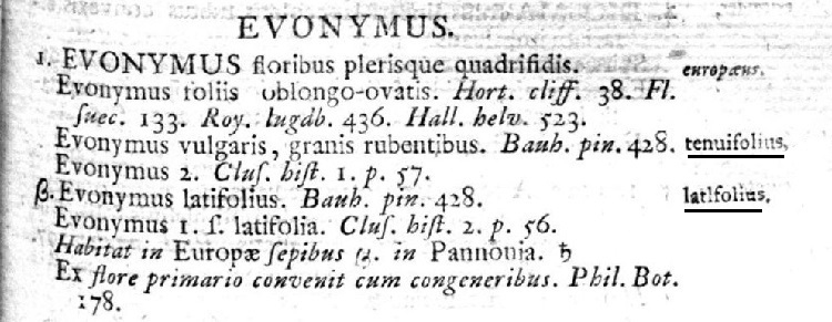 La pagina 197 del primo tomo. Per lui la specie è connotata dalla frase: ‘fiori per la gran parte divisi in quattro parti’. A destra nella zona che Linneo dedica al nome della specie compiono i nomi ‘tenuifolius’ e ‘latifolius’ ma non in corsivo, da cui deduciamo che non sono nuove specie che egli vuole introdurre. Il primo non compare nella sistematica attuale, ma il secondo è attribuito a Miller che lo annoma nel 1768 nel suo The Gardeners Dictionay. Nella denominazione ufficiale, Euonymus latifolius (L.) Mill., compare il riferimento a Linneo. Ma per Linneo E. latifolius era una varietà e non una specie indipendente come si è detto – lo testimonia la lettera greca ‘beta’ a sinistra del rigo.
