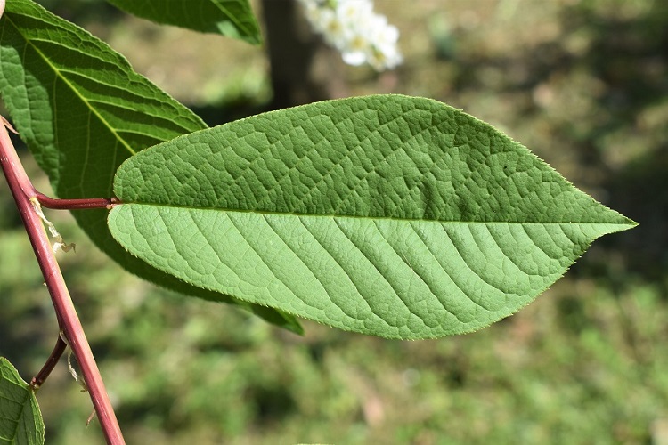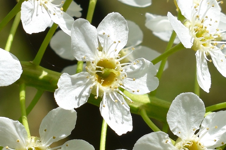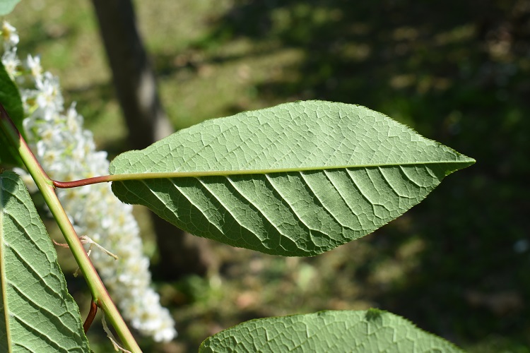 Chioma raccolta appuntita in cima, rami ascendenti i principali, sottili i secondari. Nella foto, giovane esemplare, a portamento arboreo, nel Giardino Margherita Hack.Due gemelli in Orto, nella zona delle serre nuove. Crescono un po’ più liberamente emettendo rami dalla parte bassa del tronco.L’esemplare che vive ad Agripolis (Legnaro, PD) ha aspetto decisamente arbustivo con numerosi polloni, come da manuale.Sempre emozionante imbattersi in una certa specie in natura. Inverclyde (Glasgow)Poco più in là un altro incontro.Fiorito in maggio con un mese di ritardo rispetto a Padova. Infiorescenze in vistosi grappoli bianchi che pendono disordinati, ma con grazia, dagli esili rametti. Un piacere per gli occhi……e anche per l’olfatto col loro gradevole profumo di mandorle.I singoli fioretti ermafroditi han simmetria pentagonale, numerosissimi stami dai candidi filamenti sormontati da gialle antere,……lungo pistillo giallo in alto e verde nell’ovario supero. I petali hanno unghia stretta e lamina allargata e arrotondata al vertice.Infiorescenze inizialmente erette.Foglie verde chiaro, coriacee, bordo finemente seghettato, vertice appuntito, base troncata o debolmente cordata. Il picciolo scanalato e rosso porta due ghiandole al vertice. Nella foto si distinguono bene i dentini del bordo fogliare e anche la lavorazione a sbalzo della lamina.Più evidente sulla pagina inferiore, dal colore più chiaro e leggerissimamente pelosa. Le venature secondarie si chiudono ad occhiello senza raggiungere il bordo.Inserzione alterna. Giovani rametti rossi con lenticelle chiare.I frutti sono drupe piccole e violacee. Maturano in giugno luglio e sono appetite dagli uccelli. Disposti in grappoliFrutti in formazione alla fine di aprile.Corteccia grigia con numerose lenticelle.Breve e precoce la variazione autunnale del colore (già in ottobre) a foglie gialle, ocra, rosse.