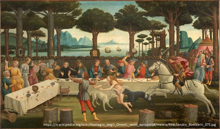 In questo post faremo uno dei giochi preferiti dal Cacciatore di Alberi: riconoscere le specie arboree presenti in un’opera d’arte. In particolare ci occuperemo della pineta raffigurata nelle prime tre tavole della tetralogia botticelliana che illustra la novella di Nastagio degli Onesti. Ma prima riassumiamo brevemente la vicenda, servendoci della sintesi che lo stesso Boccaccio fa precede al racconto. Se volete gustare integralmente la novella, potete andare a questo link. Per tutte le altre immagini del post il riferimento è alle rispettive voci di Wikipedia.