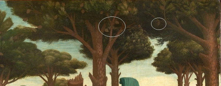 In questo particolare (del primo episodio) gli aghi che si espandono in tutte le direzioni ci parlano di pini marittimi (Pinus pinaster).Pure i coni avvalorano questa interpretazione sia per la forma alquanto allungata sia perché spesso attaccati a rami molto vecchi, carattere che il pinaster presenta abbastanza comunemente. (Particolare dal terzo episodio)Il cono del pino marittimo indugia per anni sulla pianta. Nella foto la Pineta degli Alberoni al Lido di Venezia.Al pino domestico fa invece pensare questo ramo che porta in cima rametti i cui aghisi fermano tutti alla stessa altezza. (Particolare dal secondo episodio)E anche i coni dei festoni, delle recinzioni nella terza scena, sembrano avvalorare le deduzioni su questa specie, ché i coni del pinaster sono più assottigliati. Le informazioni sembrano contraddirsi. Ma va ricordato che generalmente entrambe le formazioni arboree sono presenti nelle pinete costiere, e ciò vale anche per la Pineta di Classe, dove le due specie convivono serenamente almeno dall’XI secolo.Nell’ultimo quadro, infine, compare il mirto,… come in ogni festa di matrimonio che si rispetti.