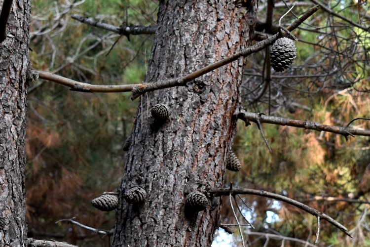 Se per gli arbusti l’identificazione è incerta, gli alberi sono sicuramente pini. Ma possiamo dire di più: la forma della chioma restringe il campo ai soli Pinus pinea e P. pinaster (si ricordi che invecchiando il pinaster tende anche lui ad avere chioma ad ombrello). Anche la corteccia dalle placche irregolari e allungate corrobora questa congettura.