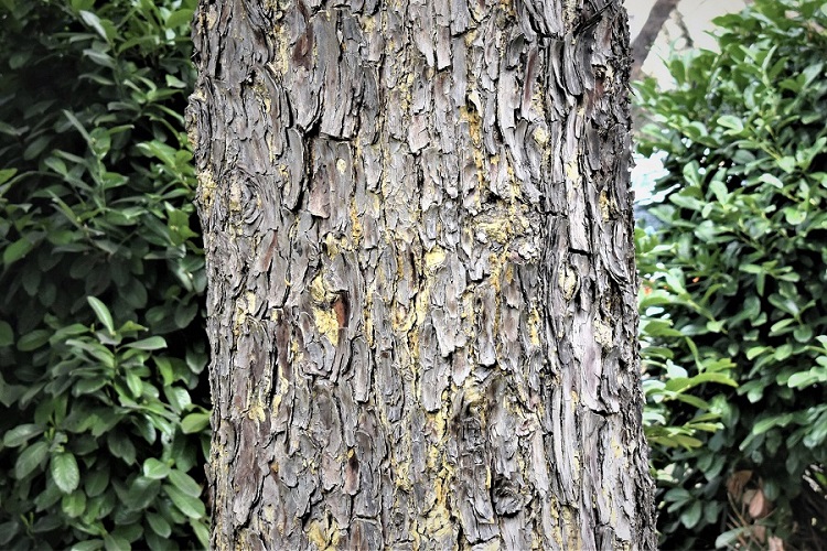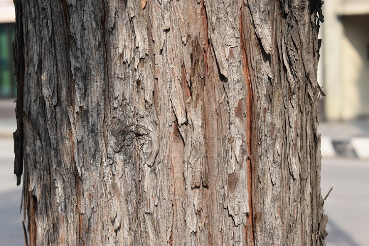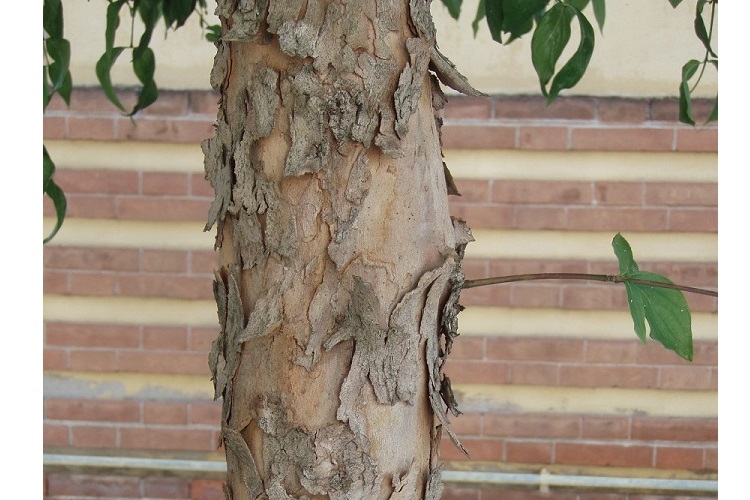 Corteccia marrone chiaro, più scura in corrispondenza delle fessurazioni. Lunghe placche sottili che si sollevano senza però aver molta fretta di cadere.
