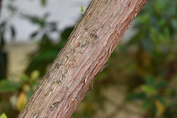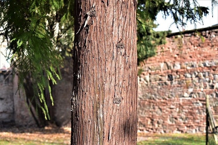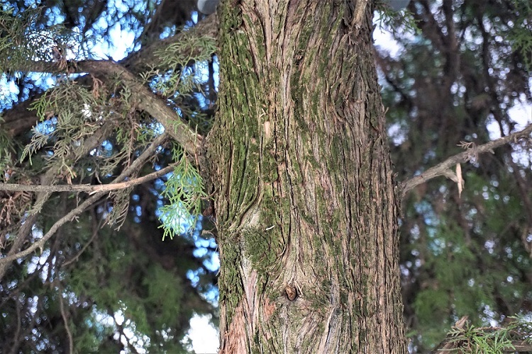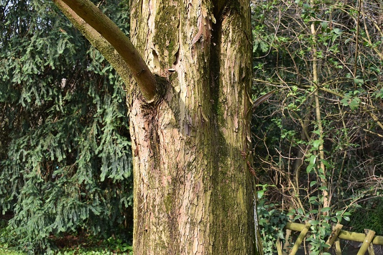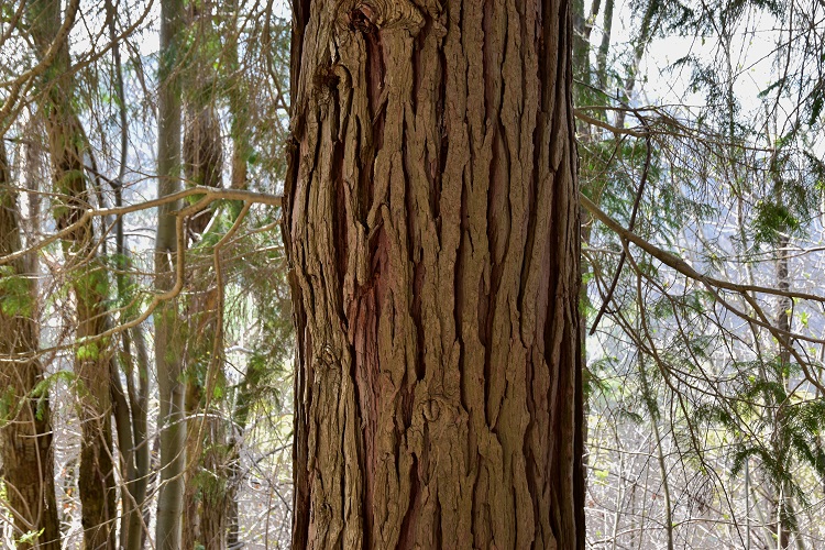 La corteccia inizialmente grigia e liscia, si screpola in lunghe e strette strisce molto tormentate; allorché dai tessuti sottostanti emerge un colorito rossastro.
