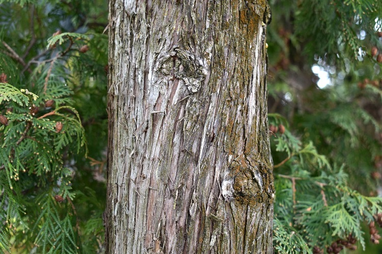La corteccia grigia e fibrosa, tende, talvolta, a diventare rossiccia.Si sfilaccia in strette strisce che si sollevano dai tessuti sottostanti e cadono dopo molto tempo.