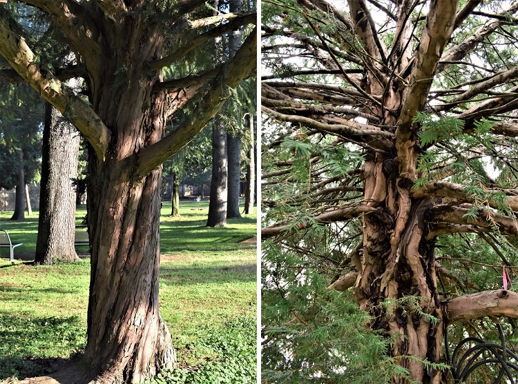 La corteccia è rosso grigiastra, e quando si fessura si sollevano ampie placche che lasciano trasparire lunghe fenditure rosso mattone.I rami più giovani sono grigioverdi con numerose lenticelle.