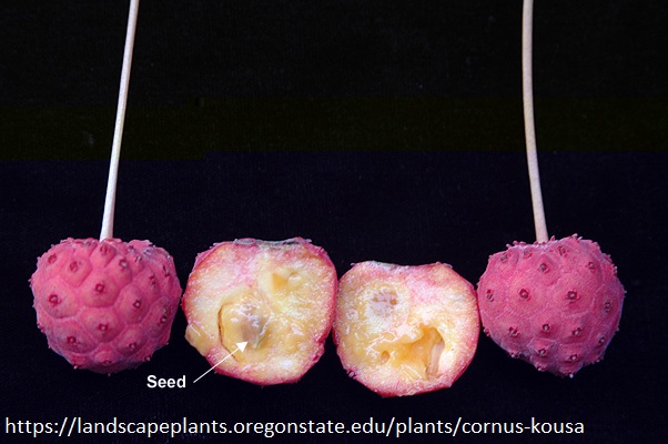 Piazzale Roma (Venezia), un breve filare di giovani kousa posti all’interno di curiose aiuole, forse a proteggerli da auto e pedoni. La strana cosa sulla destra è il frutto; ormai invecchiato in febbraio.L’esemplare dell’Orto; area delle nuove serre. I rami partono dal terreno e salendo si allargano dando alla chioma una forma a cono.Fiorito in maggio.Jardin des Plantes, Parigi. Capotesta di una lunga siepe di specie diverse di arbusti. Lui cresce anche fino a cinque metri.In autunno il kousa diventa rosso arancio.Foglia leggermente allungata, corposa ma non coriacea, vertice e base acuti; poche nervature molto chiare e incurvate a inseguire il profilo della foglia (come in tutti i Cornus).Bordo intero e leggermente stropicciato.Fiore affascinante: una bianca pezzuola con al centro un bottone verde. L’albero fiorito ne è quasi interamente ricoperto.In realtà la parte più appariscente è composta da quattro brattee, lamina larga, unghia stretta e vertice appuntito.Mentre il fiore vero è al centro. Che poi a ben guardare si rivela un’infiorescenza… …una sfera ricoperta da fioretti gialloverdi.Singoli fioretti a simmetria quaternaria. Antere viola, poi bianche di polline, petali verdi, nettario al fondo della corolla.Ritratto di un petalo. Andamento mosso.Calice a quattro lobi. Stilo dritto, breve e peloso, che termina in uno stigma piatto.Ovario inferissimo (sprofondato nel ricettacolo). Nella foto si distingue la sezione del nettario, lo stilo peloso, le antere ancora chiuse nel bocciolo, le sezioni di sepali e petali.Sezione trasversale dell’ovario, due loculi e due ovuli (come in ogni orniello).Fiori appena fecondati. Se ne stanno tutti assiepati e attaccati alla base… …come se si irradiassero da un unico punto.Insomma, strutture tubolari create dalla differenziazione del ricettacolo.Da questa strana conformazione si forma un aggregato di frutti (tecnicamente sorosio), inizialmente verde poi scarlatto a maturazione.L’incredibile frutto ricorda un solido stellato. Provate a scovarlo in questo sapiente e gustoso excursus che a partire dai solidi platonici di Leonardo giunge fino ai disegni di Escher.Solo pochissimi fiori vengano fecondati.Nela foto, del tardo inverno, si distingue il lunghissimo peduncolo.Corteccia liscia e grigia si desquama con l’età lasciando regioni variamente colorate.I tronchi si dipartono dritti ramificandosi molto presto.