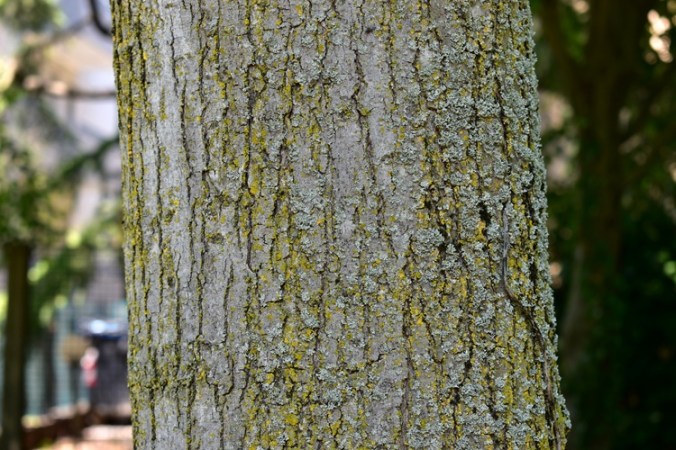 La corteccia è grigia e liscia da giovane, poi si corruga in strette creste ravvicinate e assume un colore grigio scuro, quasi nero.Poi quando invecchia diventa a piccole placche quadrangolari.