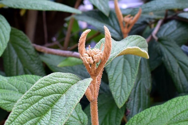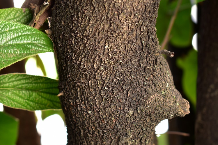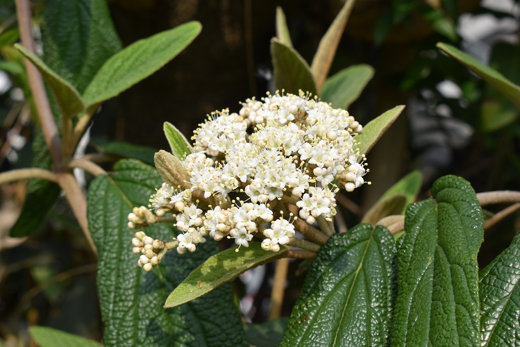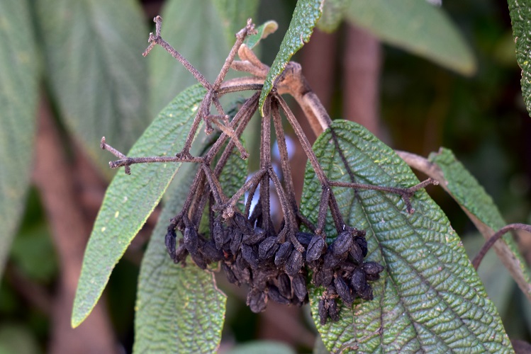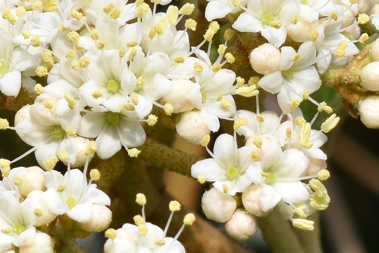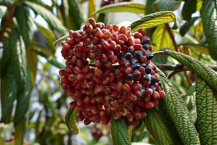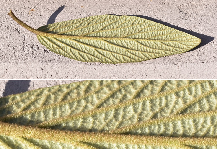 Foglia allungata lavorata a sbalzo, con venature incassate. Pagina superiore verde brillante, base e vertice appuntiti, picciolo robusto e peloso.Vale la pena osservarla più da vicino.Pagina inferiore e rametti lanuginosi di colore ruggine chiaro. In questo molto simili a quelle del nespolo giapponese. Fillotassi opposta.In aprile mette le nuove foglie di colore verde tenero, che però presto assumono una tonalità più severa.I rami dritti si innalzano allargandosi così da formare un cono sormontato da una cupola. Nella foto l’entrata dei Giardini Treves.La pianta tende ad emettere polloni. Che poco attenti giardinieri eliminano allegramente cercando di dare all’arbusto un aspetto da alberello. Giardino privato in Via AlessandriaLe lunghe foglie modellano i rami assurgenti. La pianta può raggiungere i quattro cinque metri in altezza.Alla fioritura compaiono bianchi bouquet isolati. Nella foto un esemplare del Parco Europa. Piccoli fiori biancocrema disposti in infiorescenze ad ombrella composta.Cinque petali saldati alla base e cinque stami, alternati ai petali, con filamenti bianchi e antere gialle.Pistillo tozzo con stigma giallo o rosso.In questa foto con i fiori ancora in boccio si distingue bene la struttura a ombrelle di ombrella.Le gemme compaiono già in autunno, poi si aprono in aprile complete di fiori e foglie ad annunciare il risveglio vegetativo.Frutti in formazione in giugnoGrandi globi di drupe rossissime ricoprono la pianta per tutta l’estatePoi verso settembre i frutti si scuriscono e diventano bluviolaE restano sulla pianta fino in febbraio.La corteccia marrone avvizzisce in rughe minute.A volte compaiono rametti alati.Grande rhytidophyllum in Place Saint Sulpice (Parigi)Parigi, Giardini della nuova Francia. Un piccolo giardinetto lungo la Senna ricco di piante preziose.