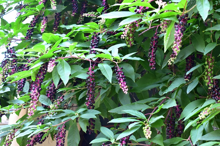Fitolacca in Orto, forse volutamente lasciata con un solo fusto. Ma lei ha il vizio di emettere polloni…Lo schema si ripete identico anche quando i fusti sono più d’uno.In inverno la pianta sembra scomparire, col fusto tanto sottile da sembrare uno stecco .Che può tranquillamente essere tagliato.Non si può certo parlare di corteccia, anche se qualcuno potrebbe annoverarla fra quelle lisce. I rami al risveglio vegetativo sono verdi, presto però tendono al rosso e al fucsia.Ottobre.Foglia allungata con vertice e base acuti, colore verde neutro e nervature chiare. Picciolo proporzionato e tendente al rossastro. Il bordo è intero.Pagina inferiore più chiara, nervature prominenti tendenti ad arrossare.Le foglie più basse, cioè più vecchie, sono molto più grandi; e tendono a smussare vertice e base.Verso ottobre si arrossano creando macchie di colore di sicuro interesse estetico. Nello stesso periodo i frutti maturi arricchiscono la tavolozza dei colori. Attenzione!: tanto belli quanto velenosi. Uno dei tanti nomi comuni è uva turca, e si capisce perché guardando l’infruttescenza: il più classico dei grappoli. I piccoli frutti inizialmente verdi diventano di un intenso bluviola. Colore che risalta sul fucsia del supporto (racemo).AgostoSettembreUna bacca, ben ordinata a simmetria decagonaleSemi neri quasi sferici.In inverno i frutti seccano e rimangono a lungo sulla piantaInfiorescenza a grappolo con piccoli fiori bianchi e verdiFiore a simmetria pentagonale privo di sepali e petali, solo tepali Cinque tepali bianchi due antere per petalo e un ingombrante pistillo verde a dieci spicchi. L’apparato riproduttivo ha una perfetta simmetria decagonale.Antere con due sacche pollinicheStigmi filiformi piuttosto corti. Ovario supero.Ogni stigma un settore separato dell’ovario e con dentro un solo uovoLa pianta è apprezzata nei giardini per le sue qualità, di cui si è detto, ma si è anche naturalizzata e colonizza sia zone cittadine sia extraurbane. Nella foto un giardinetto in Riviera dei Mugnai. I frutti sono appetiti dagli uccelli, nella foto un piccione a banchetto.FebbraioLido di Venezia, Pineta di San NicolòArgine sinistro del Brenta fra Pontevigodarzere e Limena