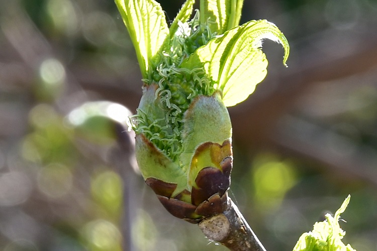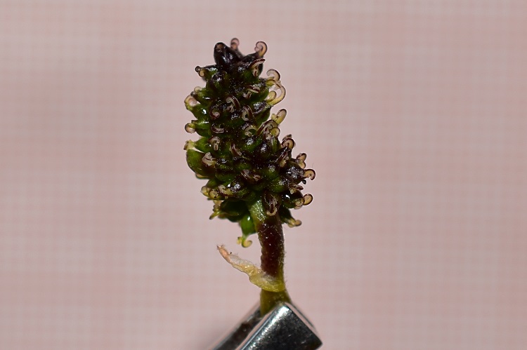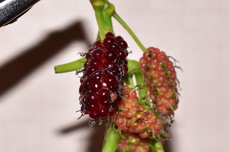 Così è per l’esemplare nella foto che orna l’entrata (Rue de Vaugirard) del Giardino del Lussemburgo a Parigi.Corteccia marrone chiaro a lunghe placche. Con l’età restano compatte, contrariamente a quelle del Gelso bianco.Impressionante la vista dell’esemplare nella sua interezzaI parigini se ne stanno a prendere il sole, perlopiù leggendo, e gustando di tanta bellezza.Rametto invernale, gemme appuntite e cicatrici fogliari ampie e chiare.Nella foto si distingue bene la gemma appuntita. Le perule sono più numerose che nel bianco e hanno una caratteristica fascia chiara lungo il bordo.Foglia coriacea con caratteristici lobi a vertice lungamente appuntito. Il colore è verde brillante, particolarmente attraente nelle giornate luminose.Non in tutte le foglie compaiono i lobi, in molte (quelle dei rami fruttiferi) son solo accennati;……altre, addirittura, han forma quasi tondeggiante, ma il vertice molto appuntito aiuta l’identificazione. Pagina inferiore molto più chiara e con venature in rilievo. Bordo a denti grandi e irregolari.Picciolo lungo e scanalato.In autunno inoltrato ingialliscono. Ma non tutte allo stesso modo, alcune assumono un bel giallo ocra lungo le venature e per il resto si tingono di colori scuri e cupi, anche viola profondo.In altri esemplari diventano giallo oro, come in questo giovanotto al Parco Perlasca.Che fa parte di un breve filare. Il più arretrato dei quattro è un Gelso bianco. Un’occasione per un confronto diretto.Il fiore sboccia in aprile. Quello femminile in infiorescenze a racemo compatte, i singoli fioretti privi di sepali e petali hanno ovario tondeggiante ed essendo vicinissimi sembrano formare una base continua, solo gli stigmi bifidi emergono dalla zona indistinta. L’identificazione del fiore femminile è complicata dal fatto che l’infruttescenza conserva la stessa forma (la nota ‘mora di gelso’), e non si è mai sicuri dell’istante in cui finisca la fioritura e cominci la fruttificazione.Fiori e infiorescenze maschili dovrebbero essere simili a quelli dell’alba, almeno a quanto giurano i manuali che tuttavia non li mostrano mai. Nella foto l’infiorescenza maschile del gelso bianco.I frutti maturano dalla fine di maggio.Le more sono inizialmente aranciate e maturando diventano granata. La forma è simile a quella del bianco ma più allungata; sembrano bastoncini grassottelli.Un elemento dirimente è la presenza di lunghi residui degli stigmi.Il fatto che in giro non ci siano kagayamae maschi, non dovrebbe avere molta importanza: i gelsi sono fra le piante che producono frutti anche in assenza di impollinazione (fenomeno noto come partenocarpia). Rimando a questo forum per una storia molto istruttiva, e tutto sommato anche divertente.Pochi sono i luoghi in città dove trovare la specie. Nella foto l’esemplare, già citato, del Parco Europa.Gli esemplari del Parco Perlasca in tenuta invernale, anche questi già incontrati.Giardino dei Salici dove vivono alcuni kagayamae; un esemplare sulla destra. Di fronte gelsi bianchi, riconoscibili dal fogliame più chiaro.