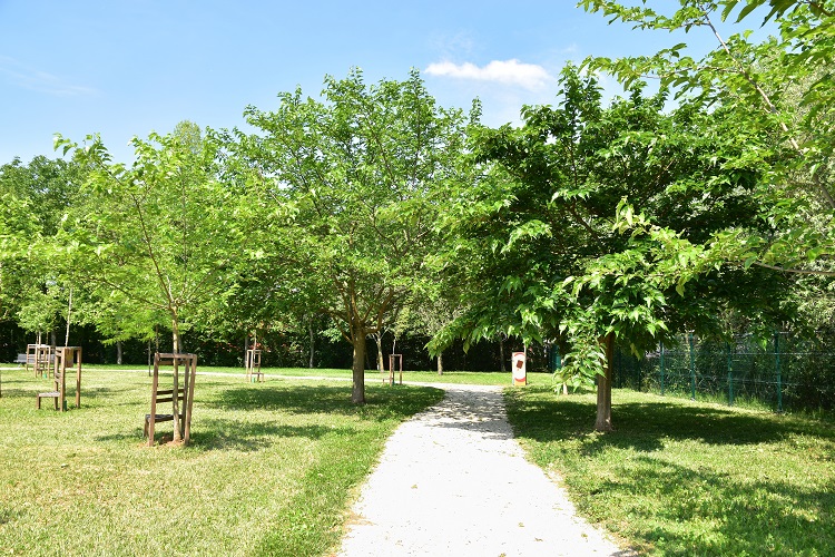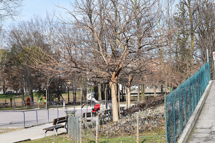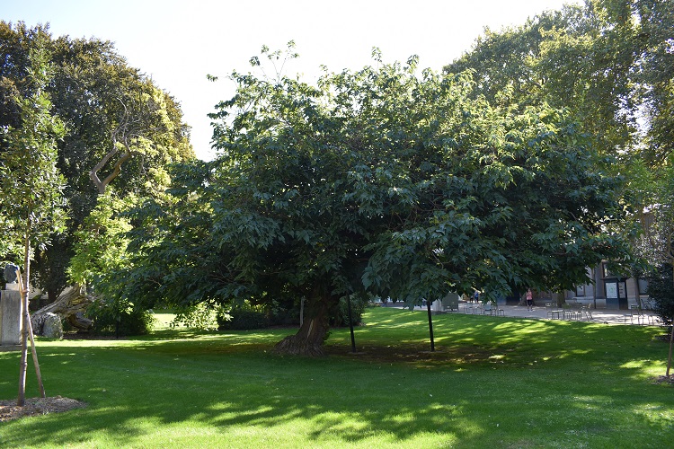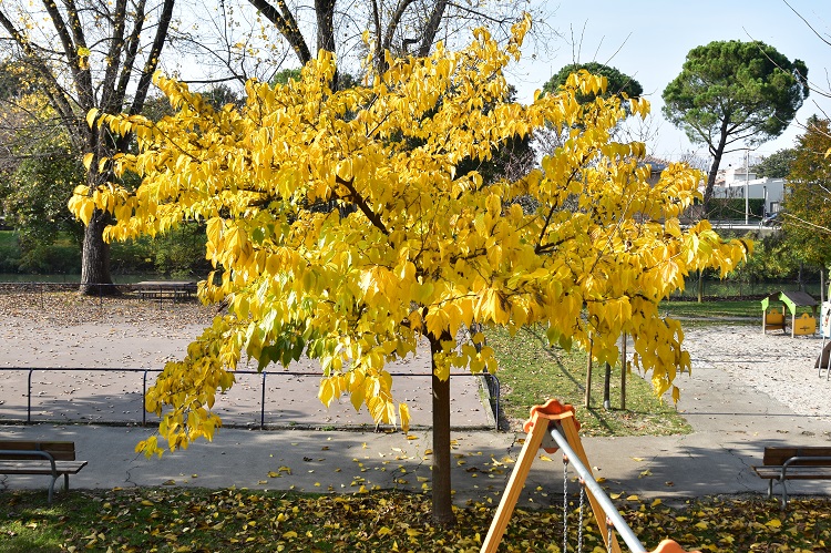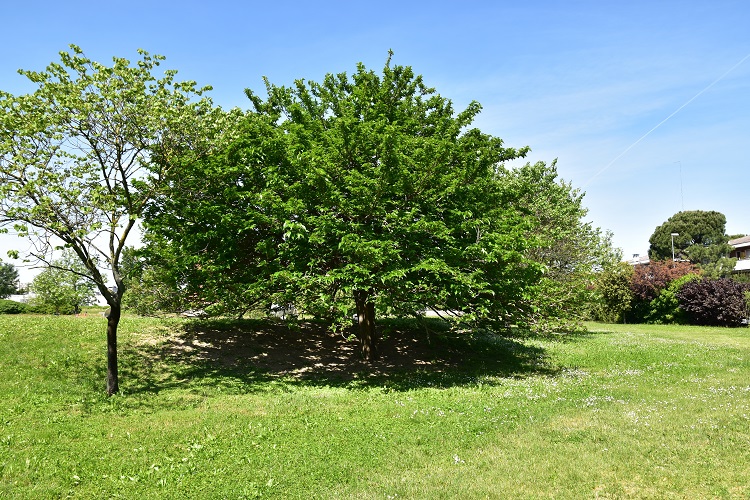 Splendido kagayamae al Parco Europa al colmo di una collinetta. Si distingue l’ombra fitta al Sole meridiano.Nella foto, in un brillante mattino d’aprile, bene si comprende il percorso dei rami principali.Anche lui, assieme a tutti i kagayamae in città, è innestato su gelso bianco; come ci ha confermato il Dottor Paolo Barbariol che ha seguito il Parco Europa sin dal suo nascere.
