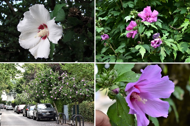 Fiori grandi in cima ai rametti, cinque petali bianchi venati di rosa e altrettanti sepali dentellati e ripiegati all’indietro. Stigmi giallognoli e stami violacei.