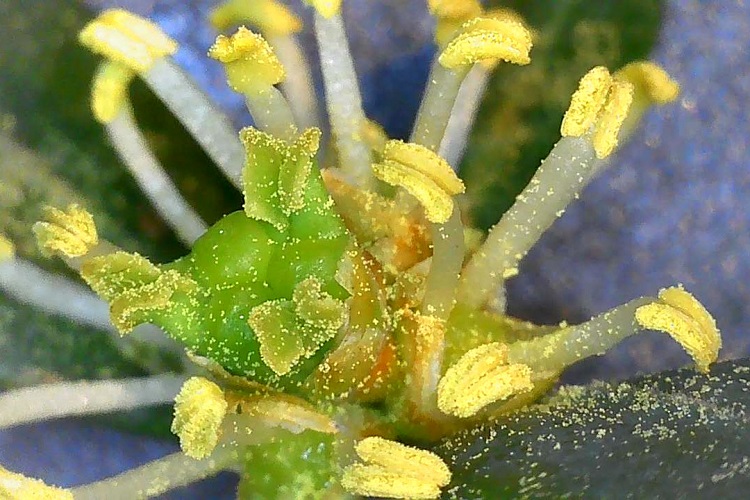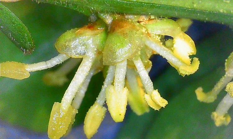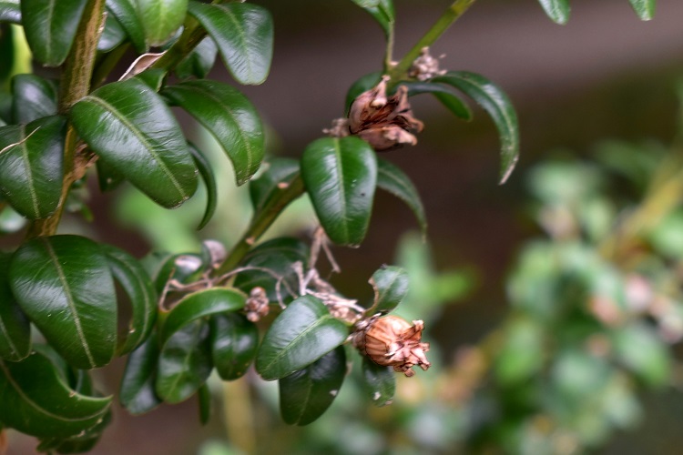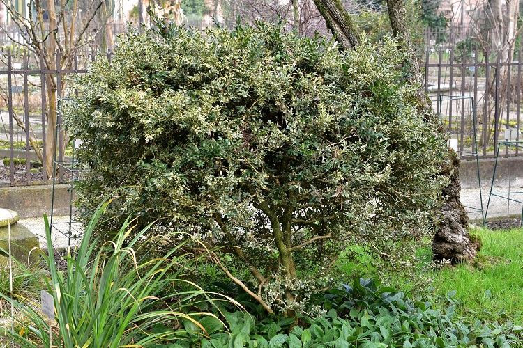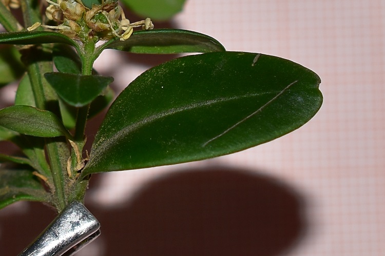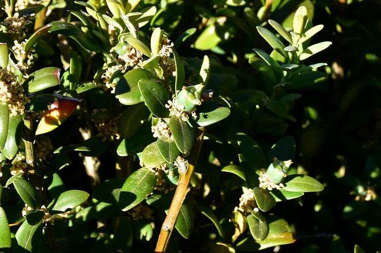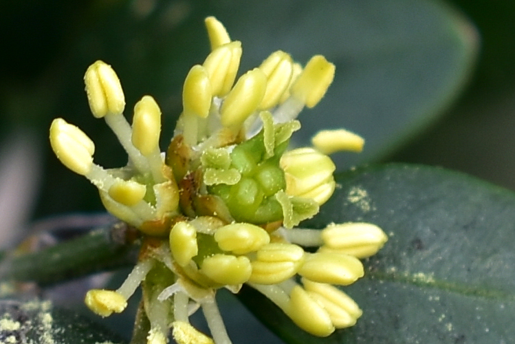 Chiostro del Beato Luca Belludi, Basilica del Santo.In vaso, lungo il sentierino dell’Orto colle etichette in braille.Arbusteto di Agripolis, Legnaro.Petit Trianon, VersailleFoglia di pochi centimetri, lucida, verde profondo, di forma allungata lievemente tondeggiante.Bordo liscio e ripiegato all’ingiù, vertice smussato o, come in questo caso, smarginato (intaccato). Pagina inferiore chiara, picciolo brevissimo.Fillotassi opposta, nodi ravvicinati che infittiscono i rametti rampanti. Nella foto si distinguono i boccioli ascellari in febbraio.Bene si percepisce la profondità del colore della foglia dal contrasto col giallo delle infiorescenze. Una sola venatura principale, impercettibili le secondarie.Fiorisce in marzo, ma quest’anno addirittura in Febbraio.Complessa l’infiorescenza a mazzolino: fiore femminile al centro coronato dai fiori maschili, in numero di cinque o sei. Fiore maschile privo di sepali e petali, solo brattee a proteggerlo; quattro stami verdastri ad antere giallognole con due sacche polliniche. Gli stami sono piantati su un basamento nettarifero, per il piacere delle api. Peduncoli assenti. Il fiore femminile, vero protagonista della composizione, ha tre robusti stili verde smeraldo con in cima stigmi bifidi. Tre ovari separati ma strettamente legati fra loro.Ovuli millimetrici e trasparenti.In aprile cominciano a formarsi i frutti mentre seccano i fiori maschiliUna capsula tricuspidata……che ricalca nella forma il pistilloLa capsula secca si apre in settembre.Tre valve (la sutura passa per i residui dei pistilli). Dentro due semi per loculo. Crediti della fotoCorteccia grigiobruna con lievi e fitte screpolatureDa giovane con minute lenticelle.Può capitare a certi esemplari di arrossarsi nei mesi più freddi, e allora lo spettacolo lascia senza fiato.Era solita regalarcelo una breve siepe che viveva ai Giardini alla Rotonda. Uccisa durante i recenti lavori di ristrutturazione. Forse gli operatori non erano stati avvisati del fenomeno, sta di fatto che il tenero spettacolo è perso per sempre.