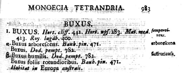 Buxus sempervirens L. Il nome scientifico fu assegnato da Linneo nella prima edizione del celeberrimo Species Plantarum, 1753. Carl Nilsson Linneaus concepì la moderna classificazione scientifica degli esseri viventi, e introdusse la nomenclatura binomia (Systema Naturae, 1735).