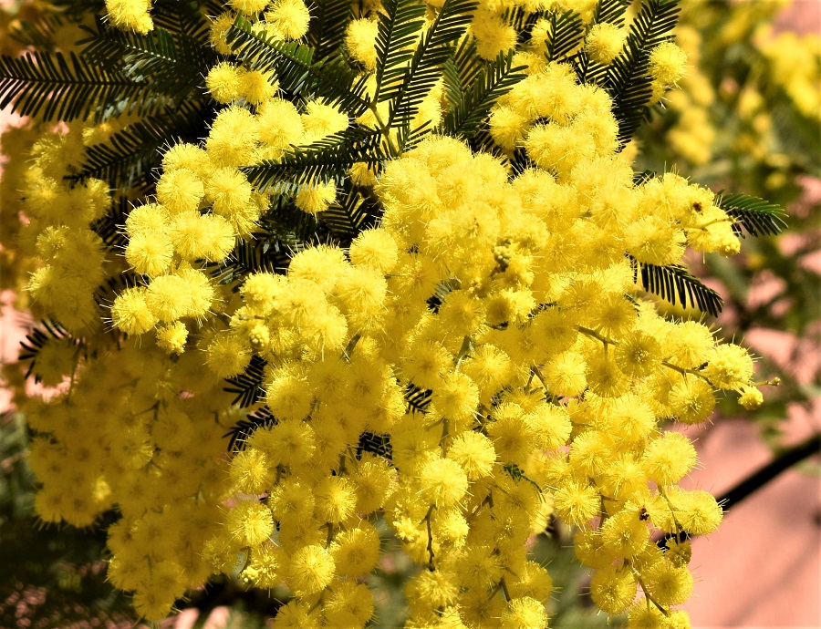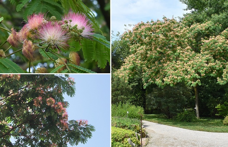 Mazzi di fiori piumosi ricoprono interamente la chioma tingendola di giallo o di rosso, anche il fogliame contribuisce ad un generale senso di leggerezza.