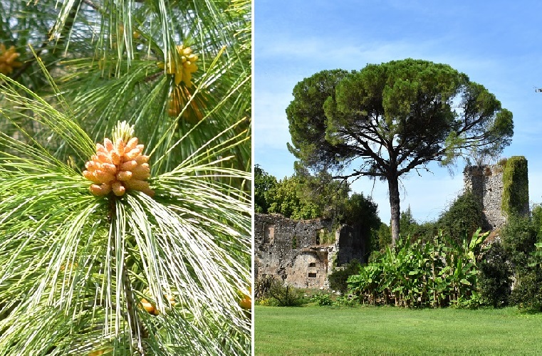 Tutti i pini fioriscono allo stesso modo: infiorescenze maschili (le sole ben visibili) composte da amenti ellissoidali gialli o rosati raggruppati in strutture assurgenti alla base del nuovo getto.