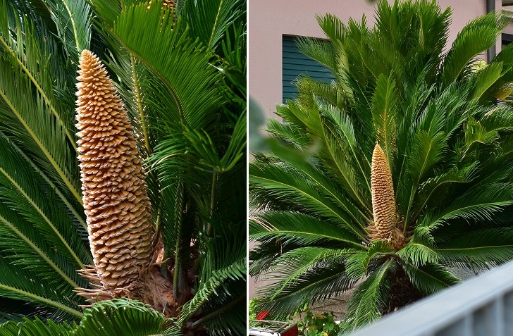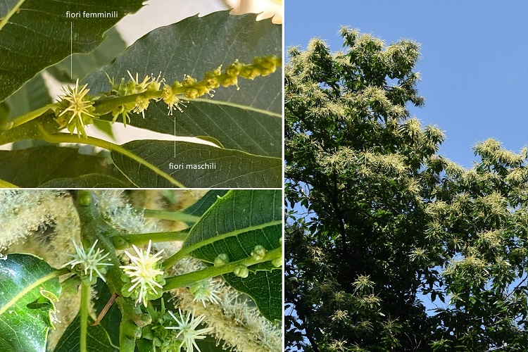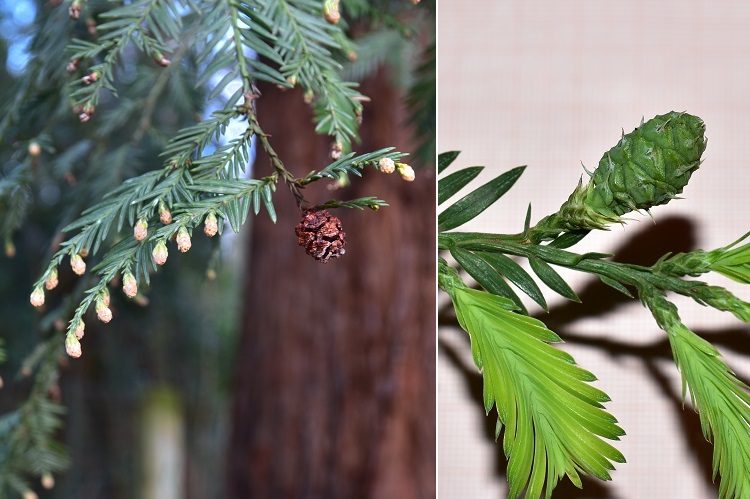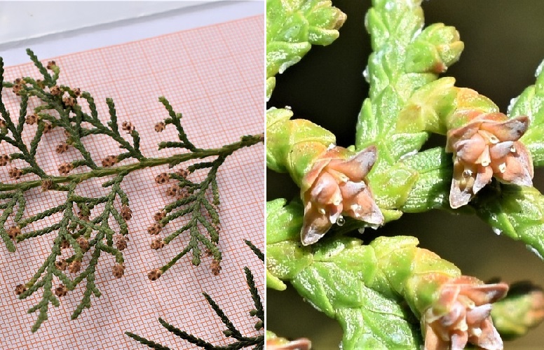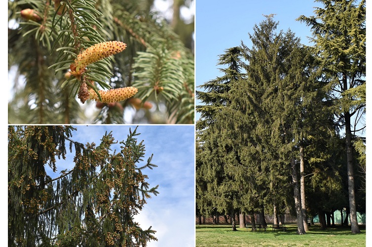 L’albero appare, nel periodo della fioritura, punteggiato di pallini giallo ocra, sono i piccoli coni maschili; difficilissimi da scovare quelli femminili.