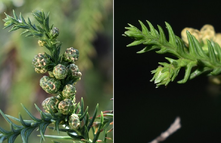 Coni maschili cilindrici e affusolati dal colore aranciato; le diverse orientazioni delle infiorescenze danno al ramo un aspetto scompigliato. Da lontano la fioritura non si avverte se non per un diffuso pallore sui rami scuri.